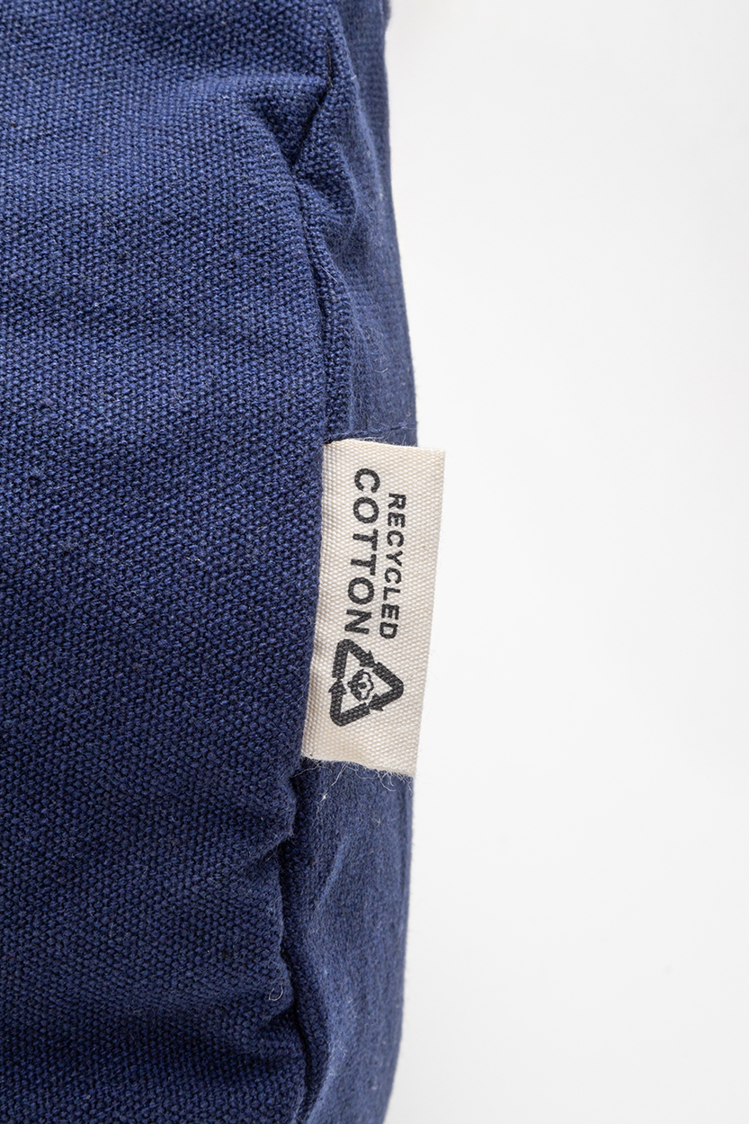 Borsa sportiva in tela composta da 70% cotone riciclato e 30% poliestere riciclato, con scomparto principale e tasca interna chiuse da cerniera, manici lunghi ed etichetta cotone riciclato.