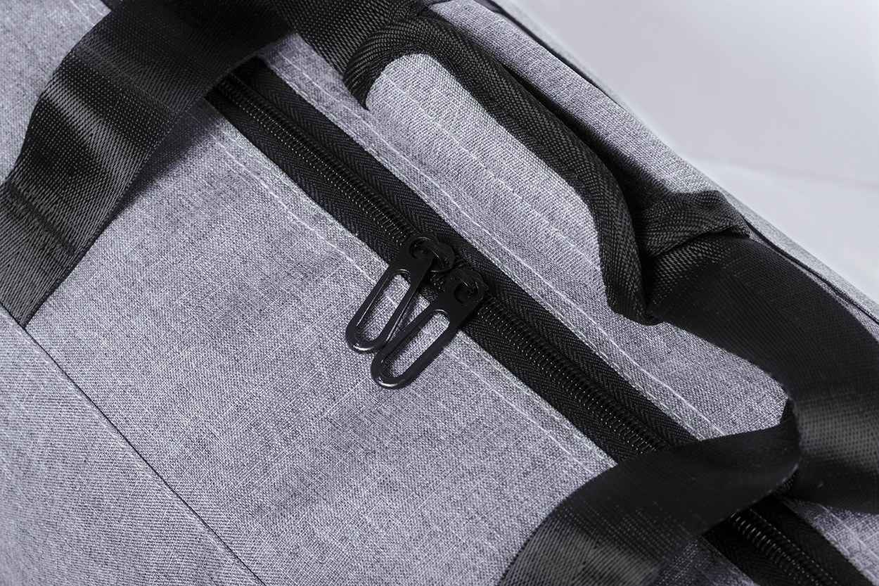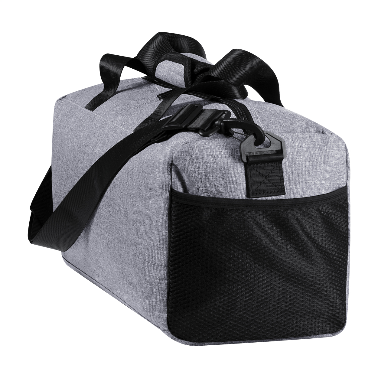 Borsone sportivo con scomparto interno con chiusura a zip, tasche laterali in rete e tracolla regolabile, materiale poliestere 600D.