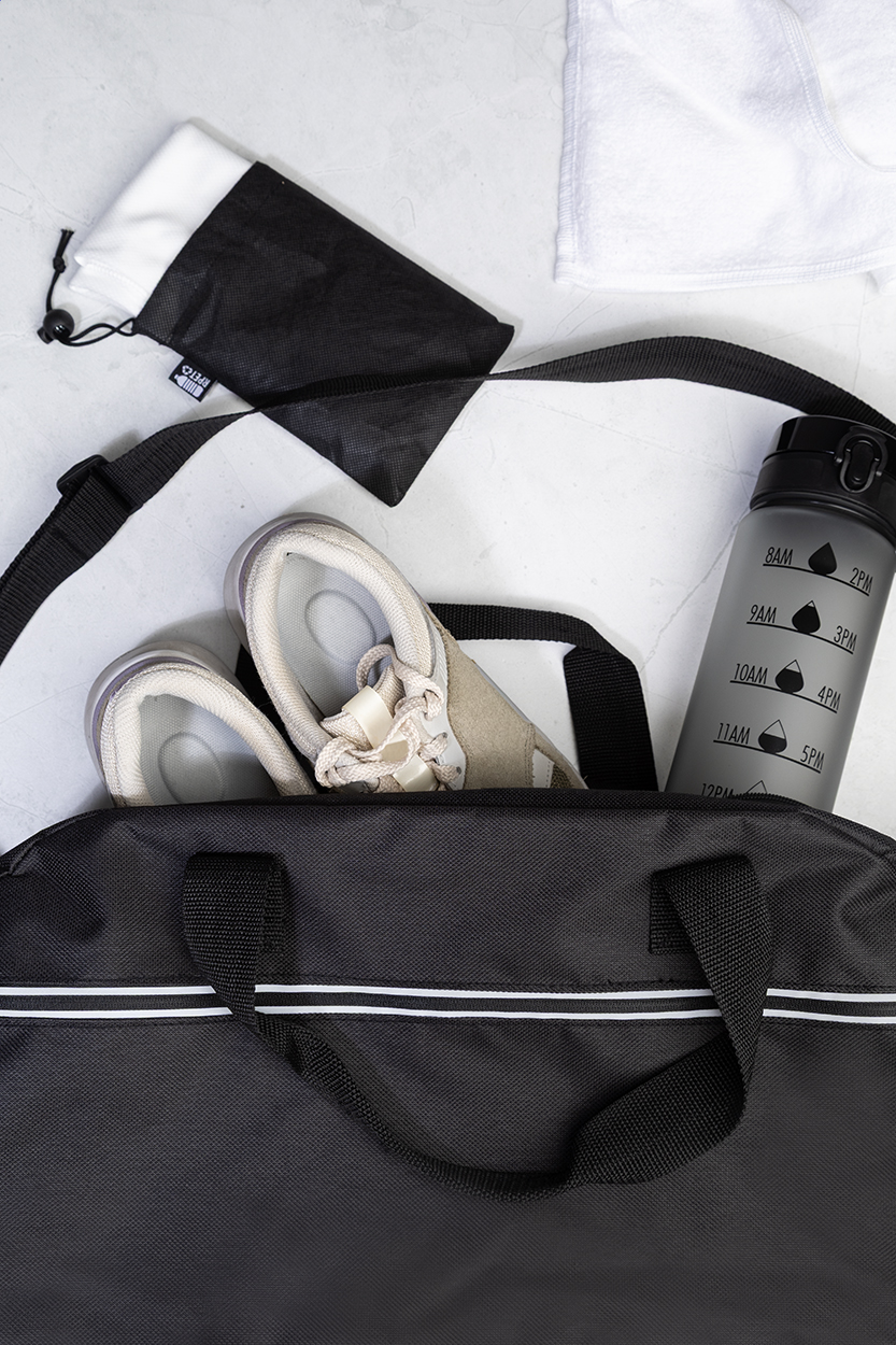 Borsa sportiva in poliestere 600D RPET con scomparto principale e tasca frontale chiusi da cerniera, strisce riflettenti, tracolla regolabile ed etichetta RPET.