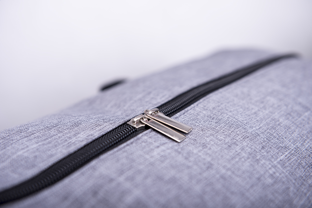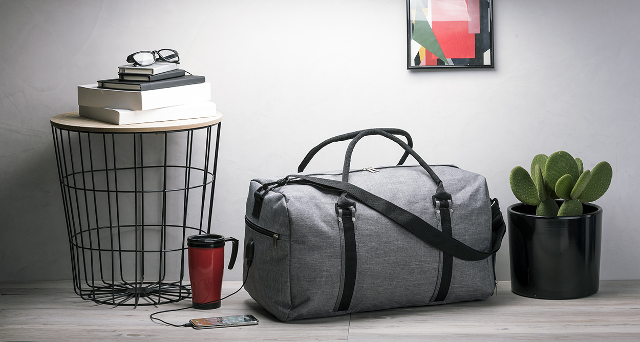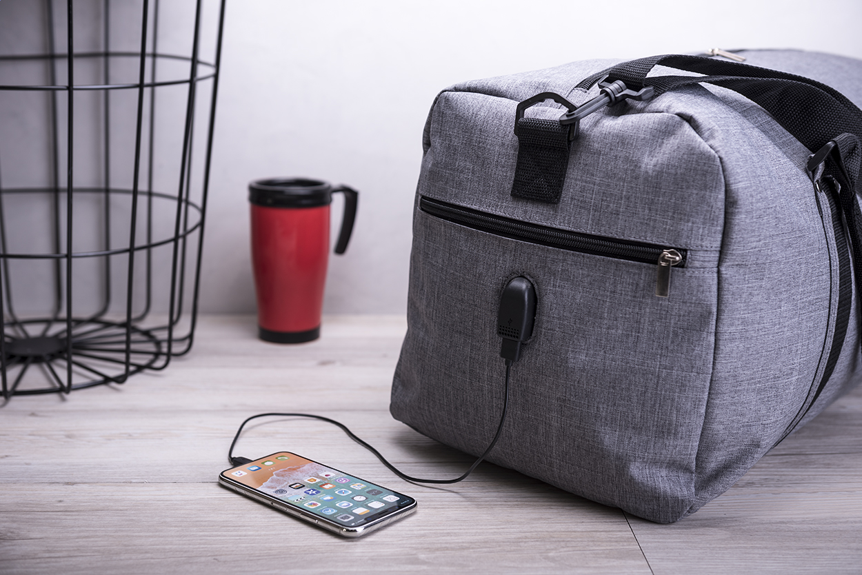 Borsa sportiva con scomparto e cerniera, tracolla e connettore USB integrato per power bank. Poliestere 600D.
