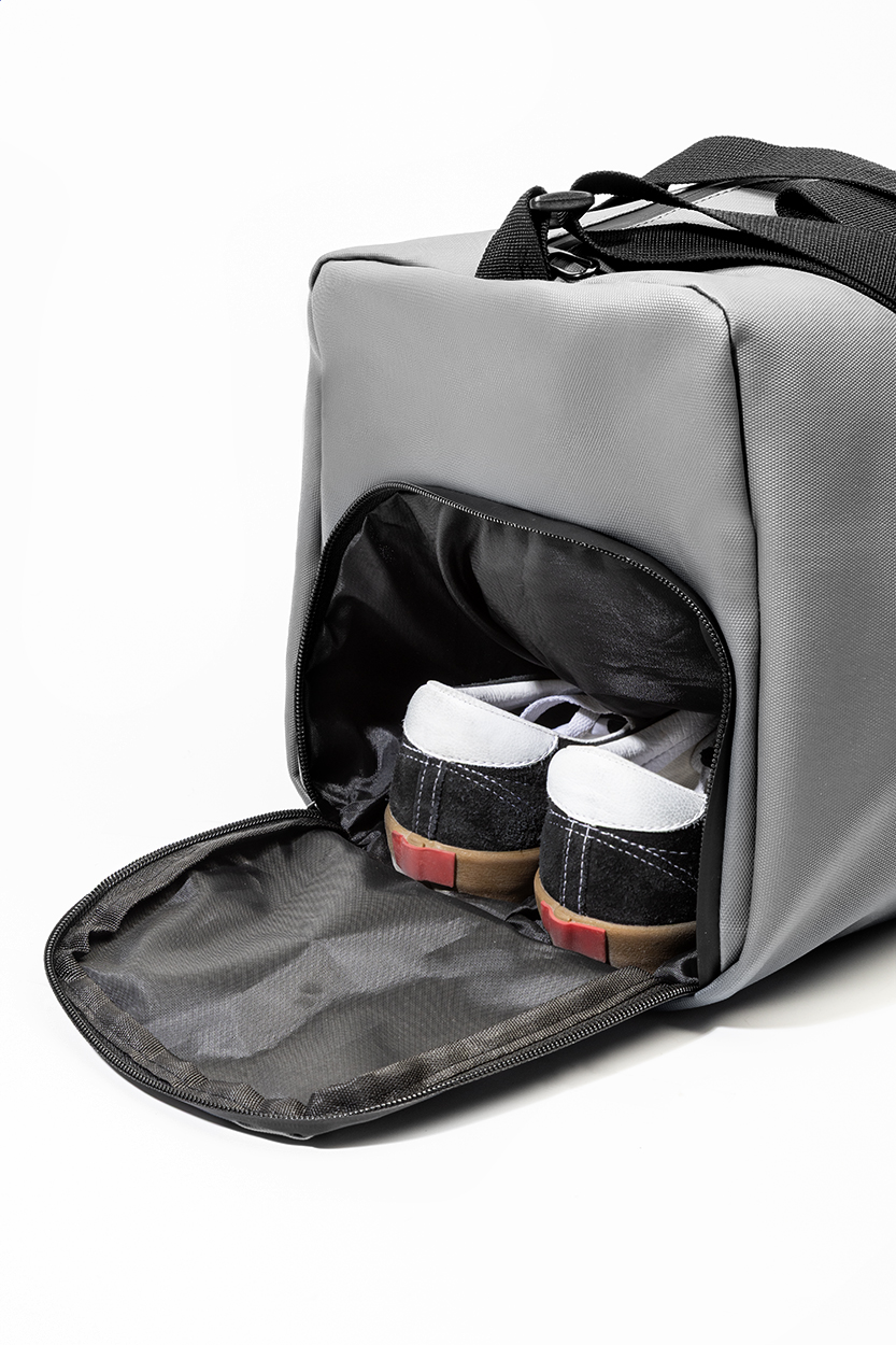 Borsa sportiva impermeabile in 600D RPET rivestita in PU con scomparto principale, tasca frontale e scomparto per scarpe chiusi da cerniere, tracolla regolabile ed etichetta RPET.