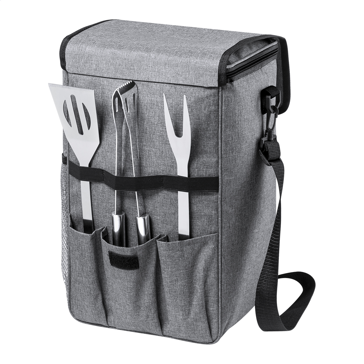 Set barbecue da 6 pezzi in acciaio e legno. Il set è composto da 2 coltelli, acciaino, pinza, forchetta, tagliere e valigetta con chiusura a cerniera.
