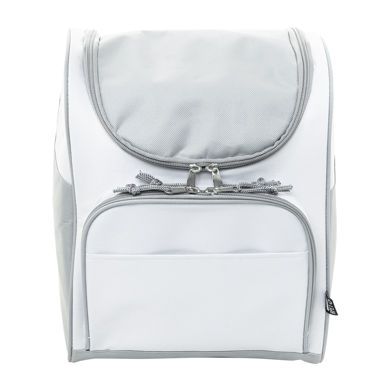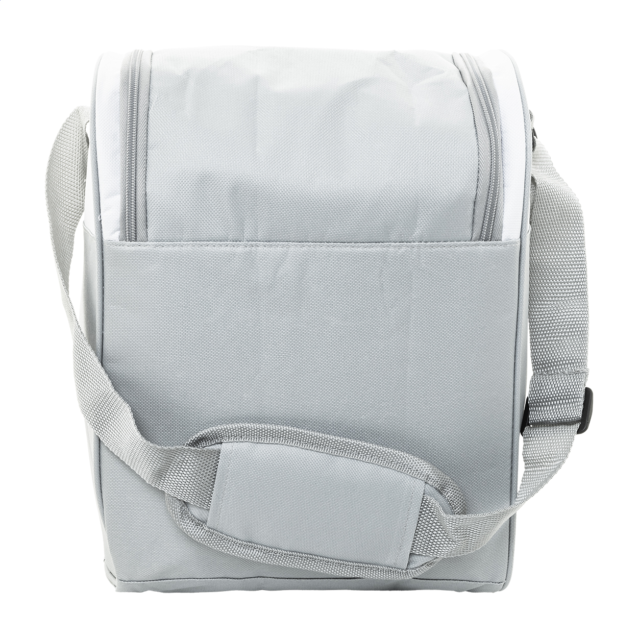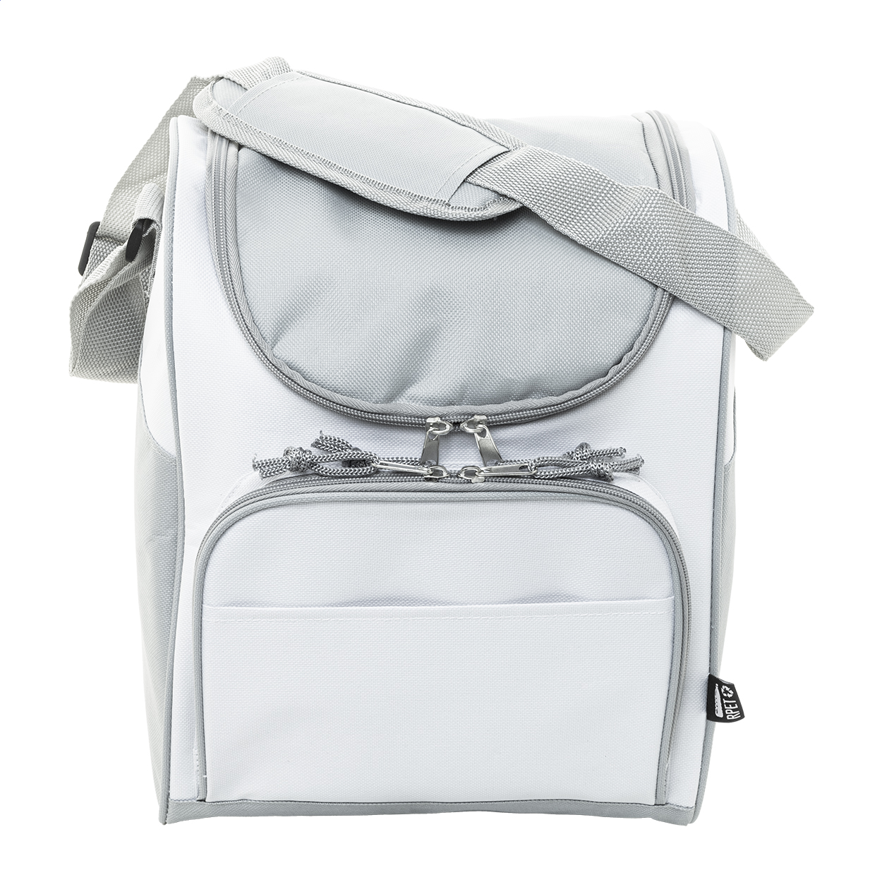 Borsa termica in poliestere 600D RPET con imbottitura in alluminio, 2 scomparti chiusi da cerniera, piccola tasca frontale, tracolla regolabile ed etichetta RPET.