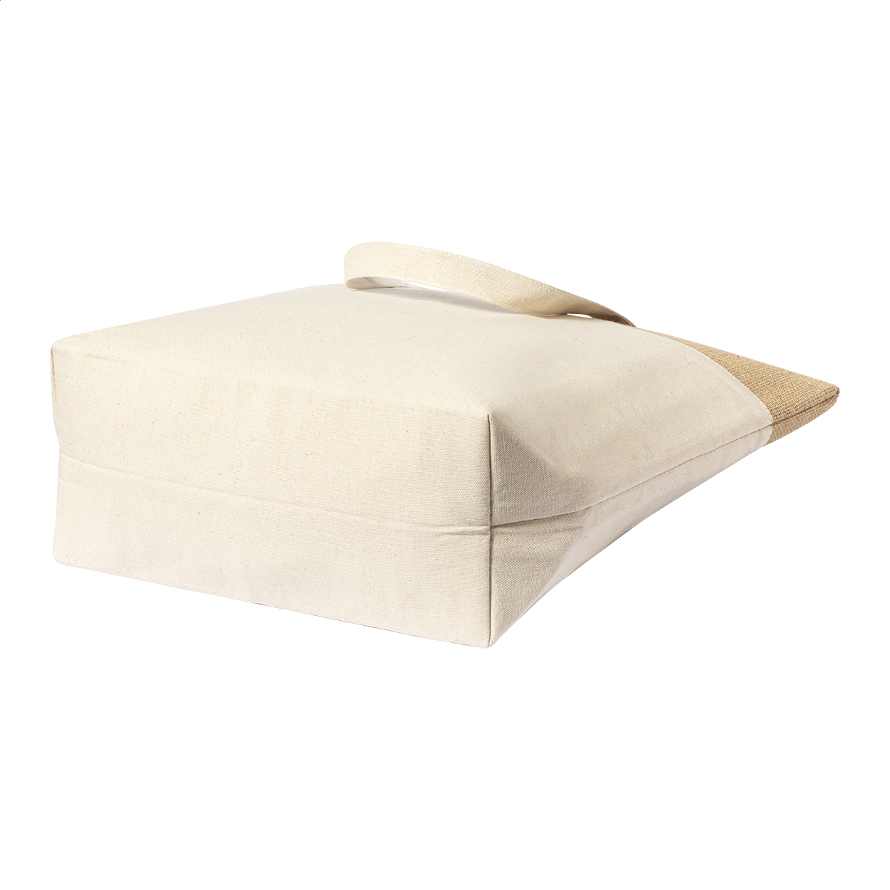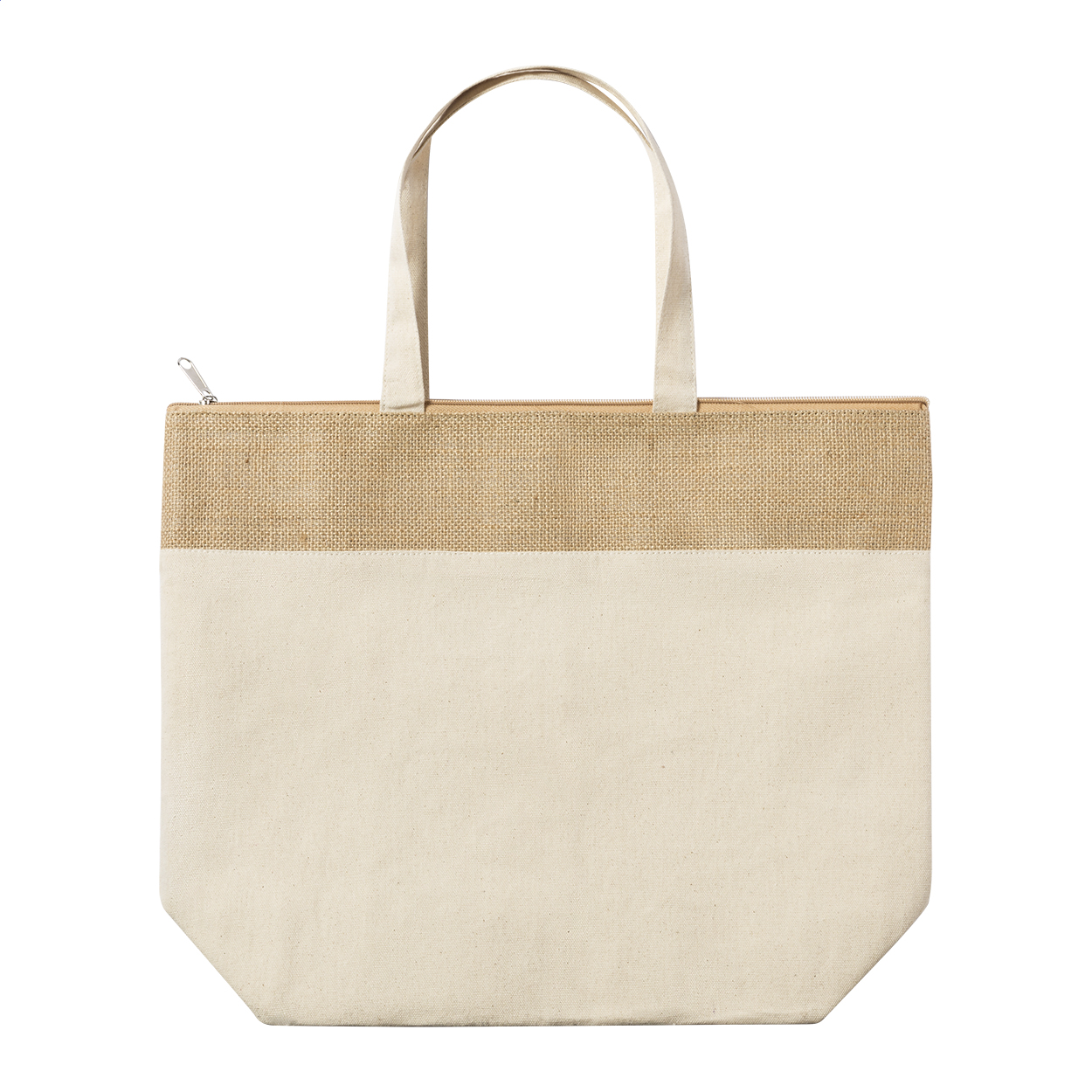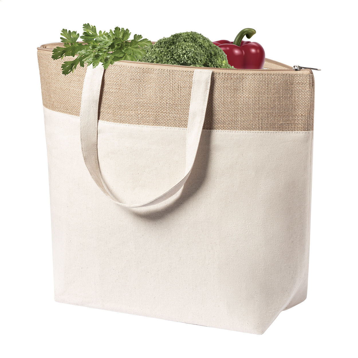 Borsa frigo in 100% cotone e juta laminata con imbottitura in alluminio e scomparto con zip.