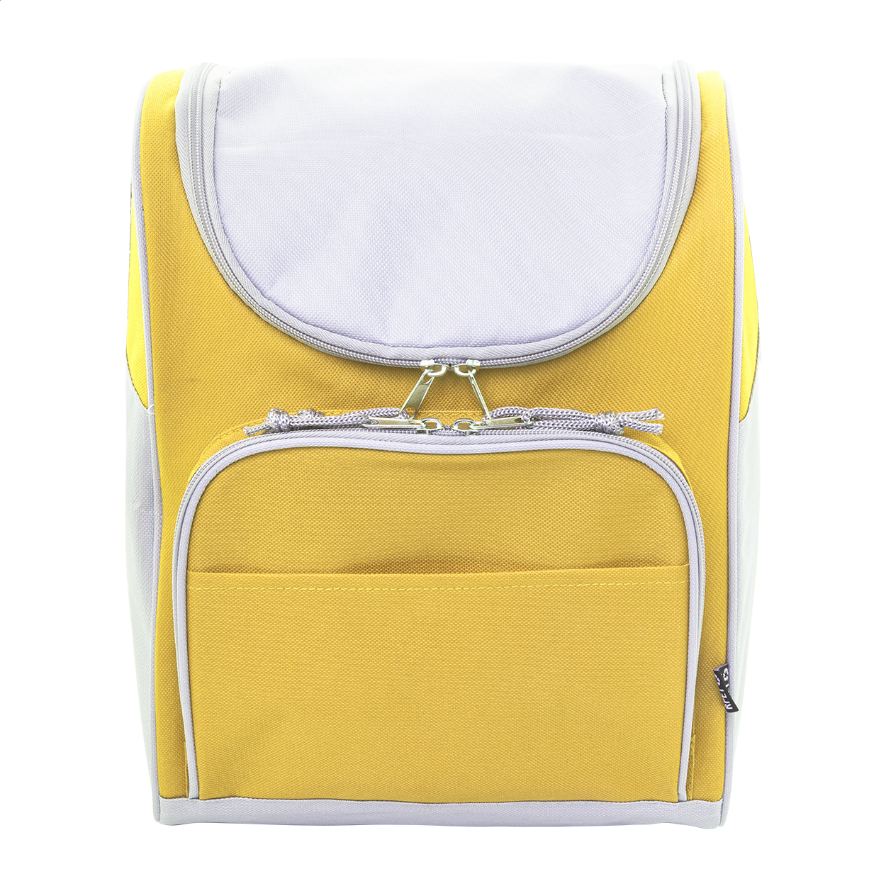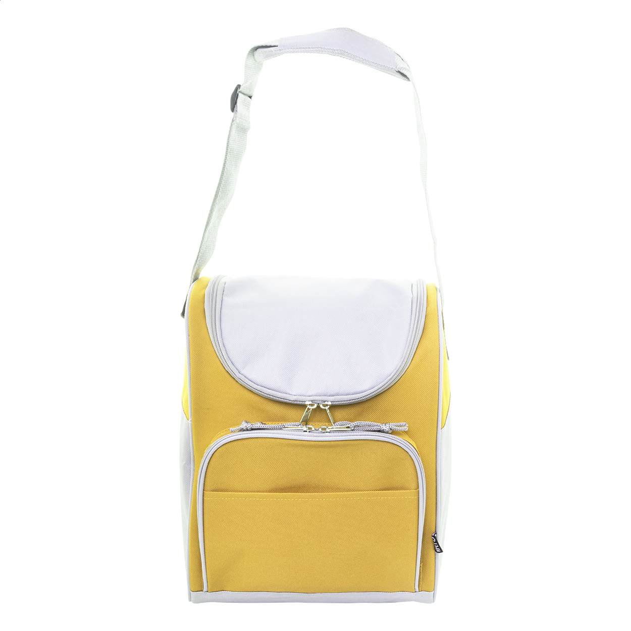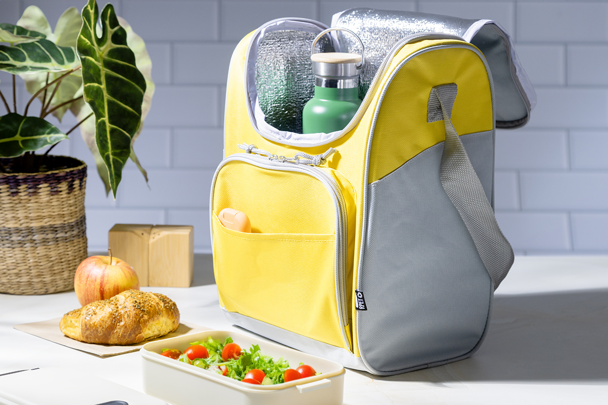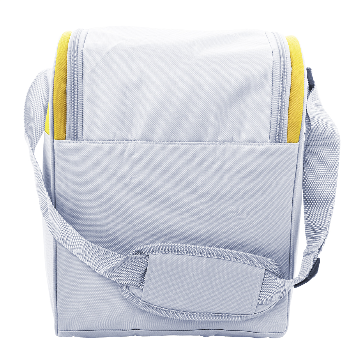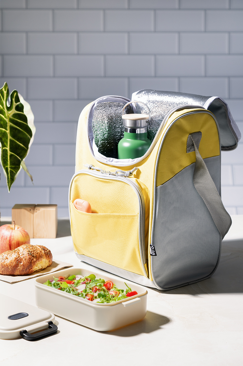 Borsa termica in poliestere 600D RPET con imbottitura in alluminio, 2 scomparti chiusi da cerniera, piccola tasca frontale, tracolla regolabile ed etichetta RPET.