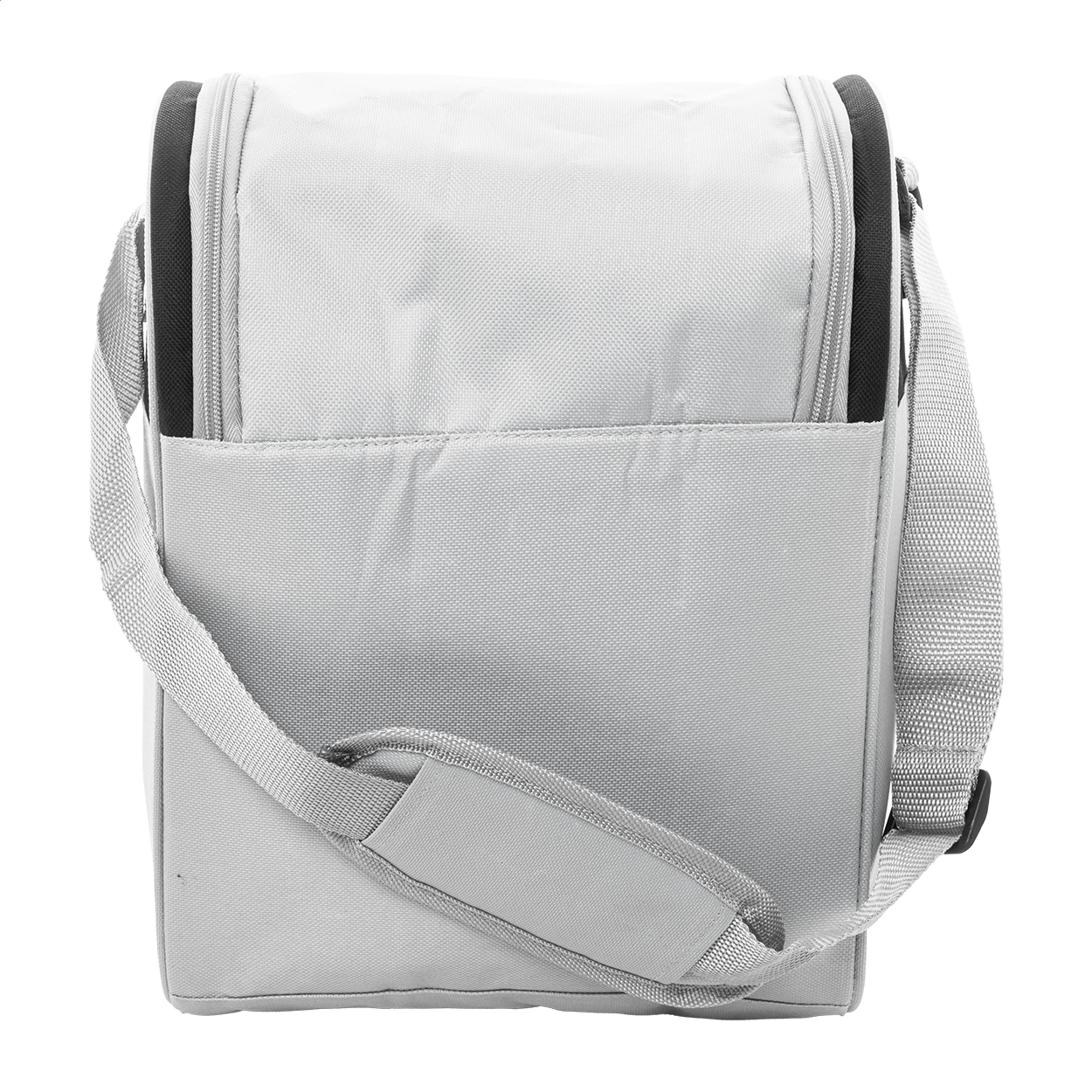 Borsa termica in poliestere 600D RPET con imbottitura in alluminio, 2 scomparti chiusi da cerniera, piccola tasca frontale, tracolla regolabile ed etichetta RPET.