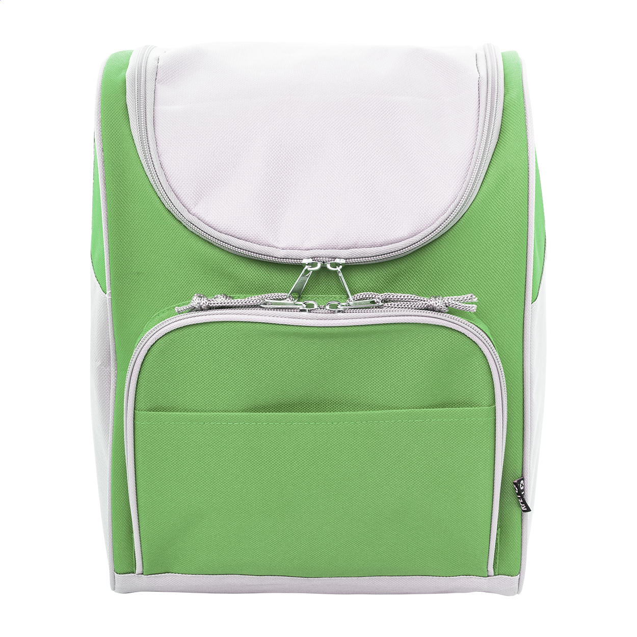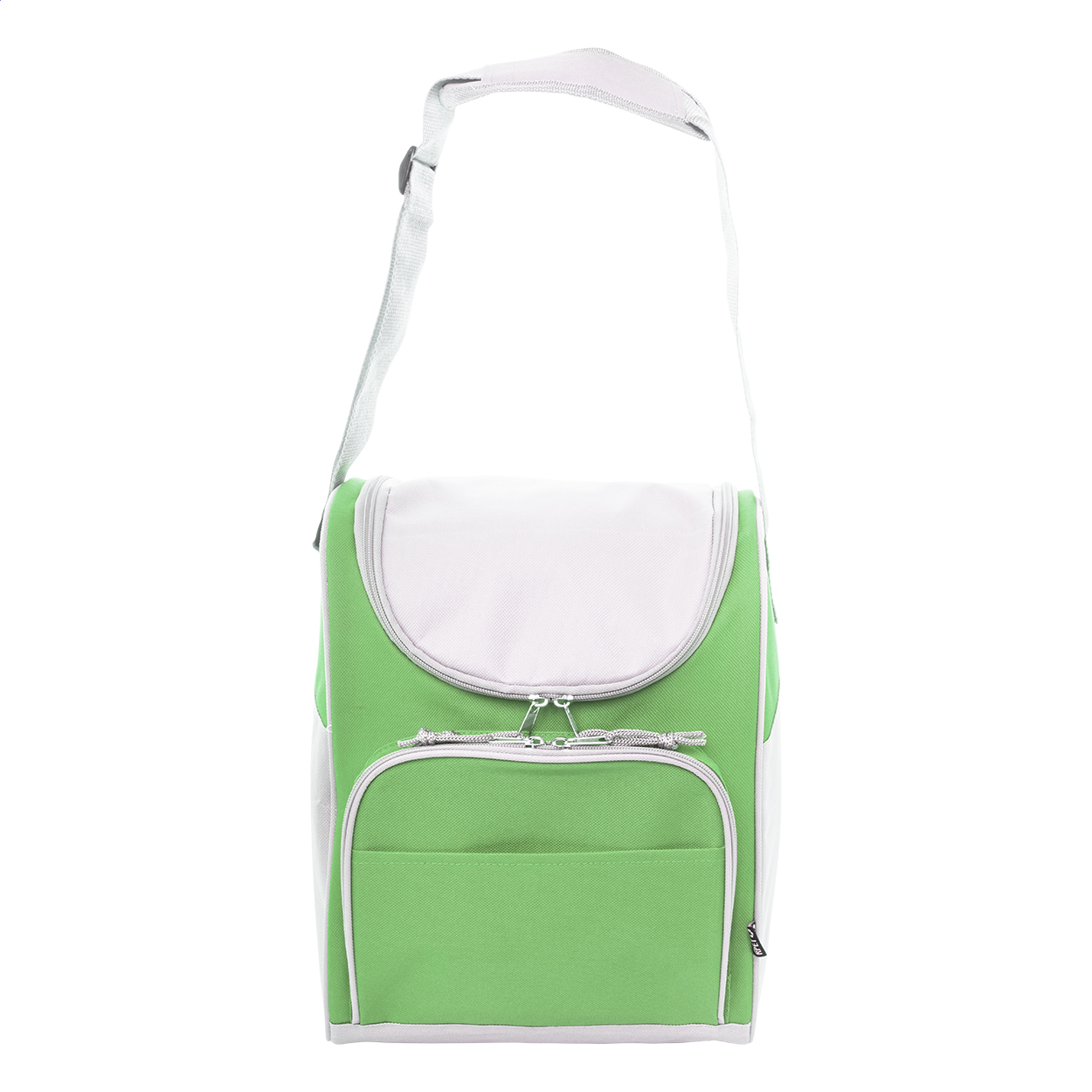 Borsa termica in poliestere 600D RPET con imbottitura in alluminio, 2 scomparti chiusi da cerniera, piccola tasca frontale, tracolla regolabile ed etichetta RPET.