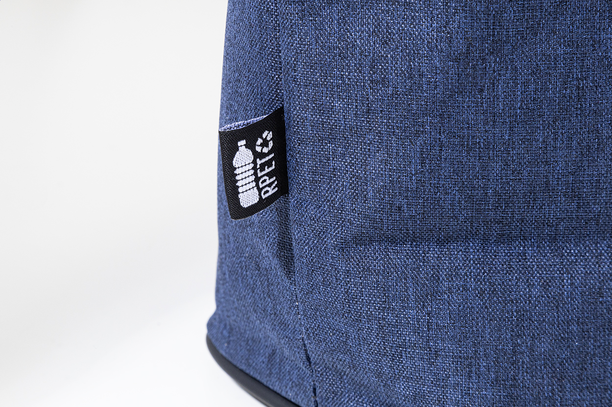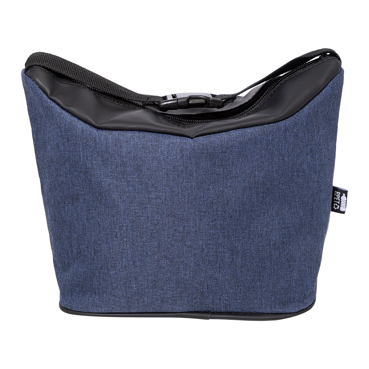 Borsa termica in poliestere 600D RPET con cerniera, dettagli in morbida pelle PU riciclata, imbottitura in alluminio, tracolla con fibbia ed etichetta RPET.