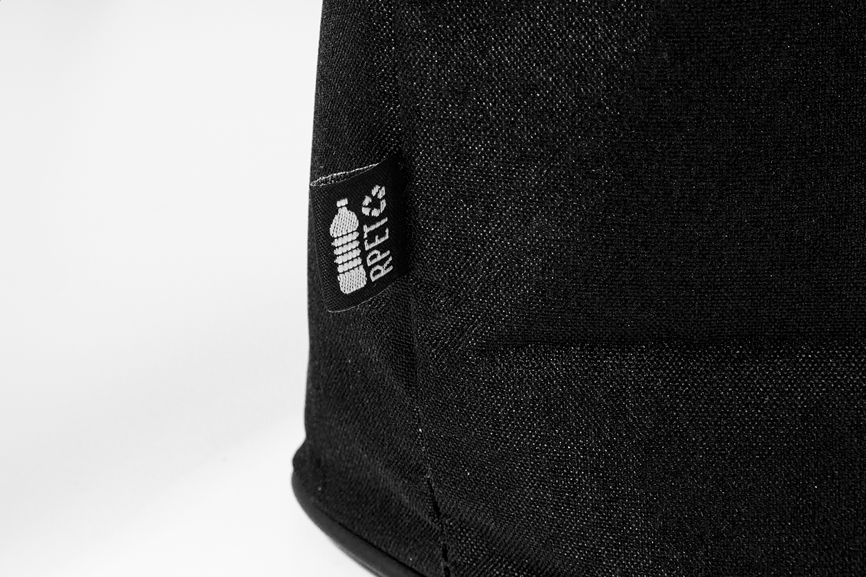 Borsa termica in poliestere 600D RPET con cerniera, dettagli in morbida pelle PU riciclata, imbottitura in alluminio, tracolla con fibbia ed etichetta RPET.