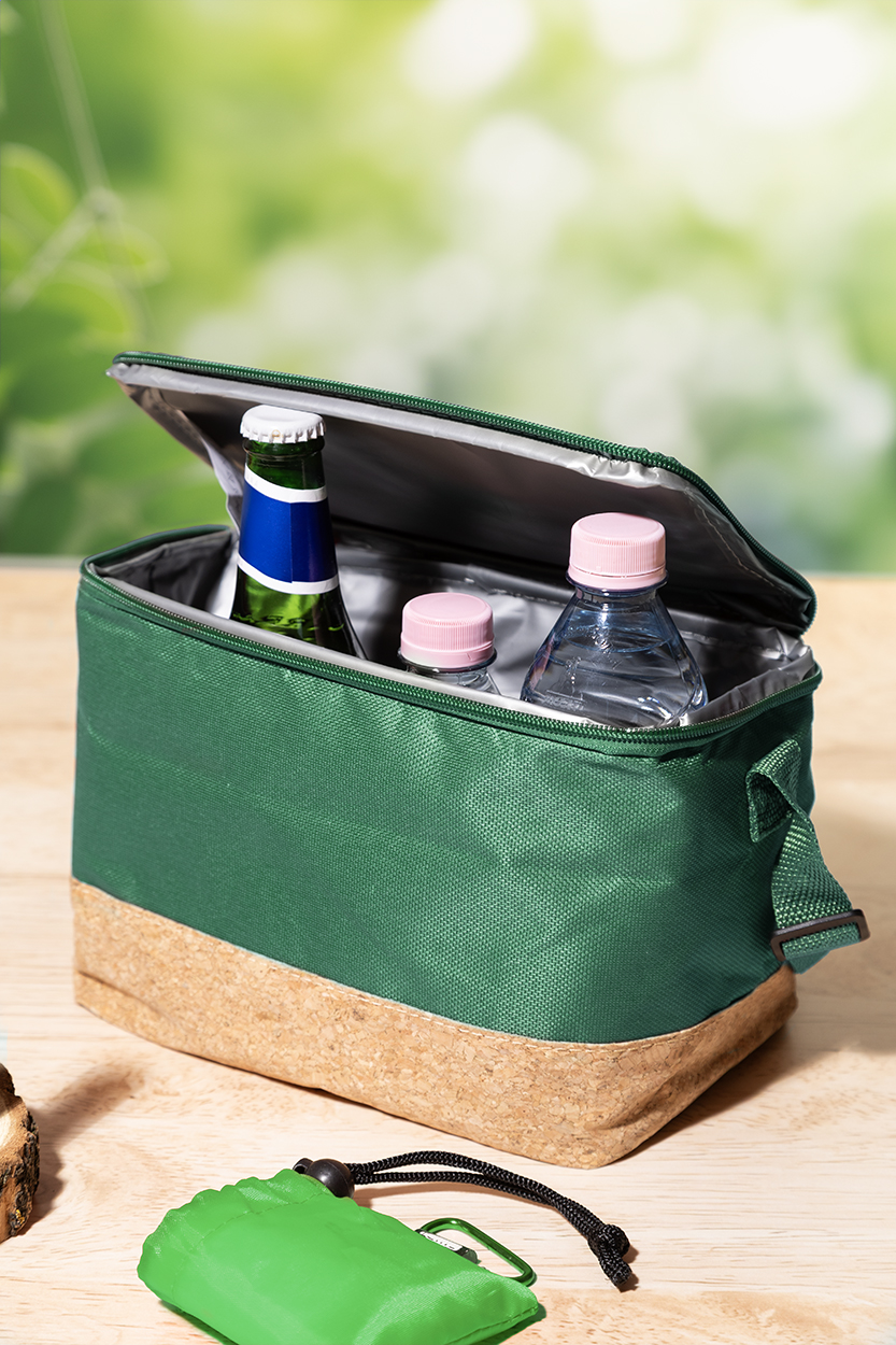 Borsa termica in poliestere 600D RPET con cerniera, base in sughero naturale, imbottitura in PEVA, tracolla regolabile ed etichetta RPET.