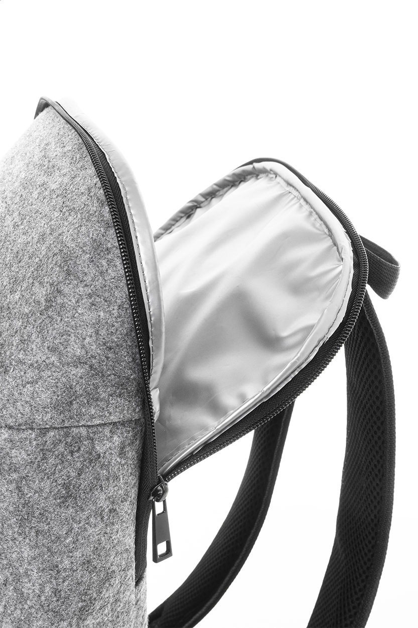 Zaino termico in feltro RPET con imbottitura in PEVA, spallacci imbottiti, scomparto principale con cerniera, tasca frontale ed etichetta RPET.