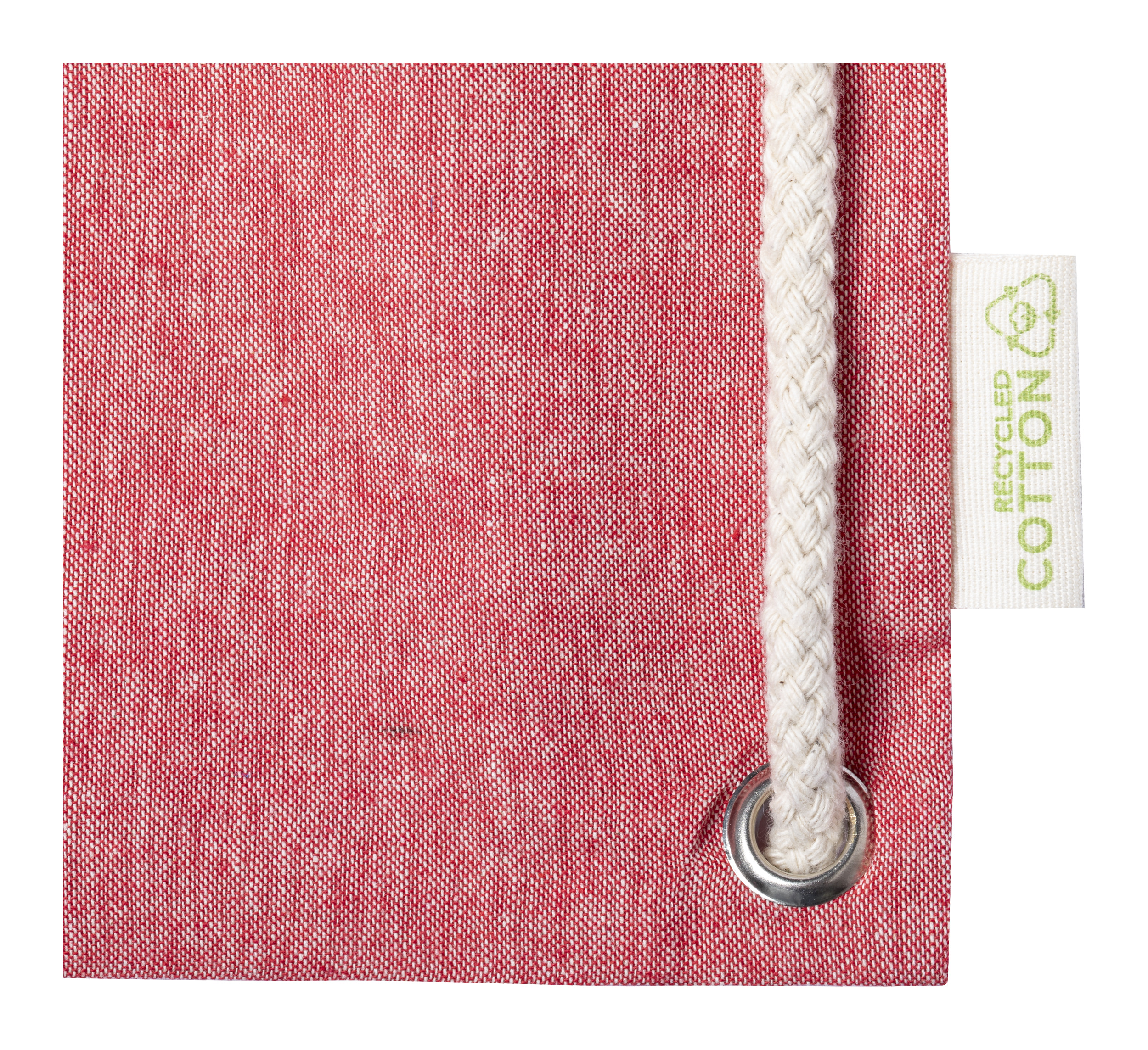 Borsa con chiusura a coulisse in cotone riciclato e lunghi cordoncini intrecciati e spessi. Può essere utilizzata anche come borsa per la spesa. 100% cotone riciclato, 140 g/m².