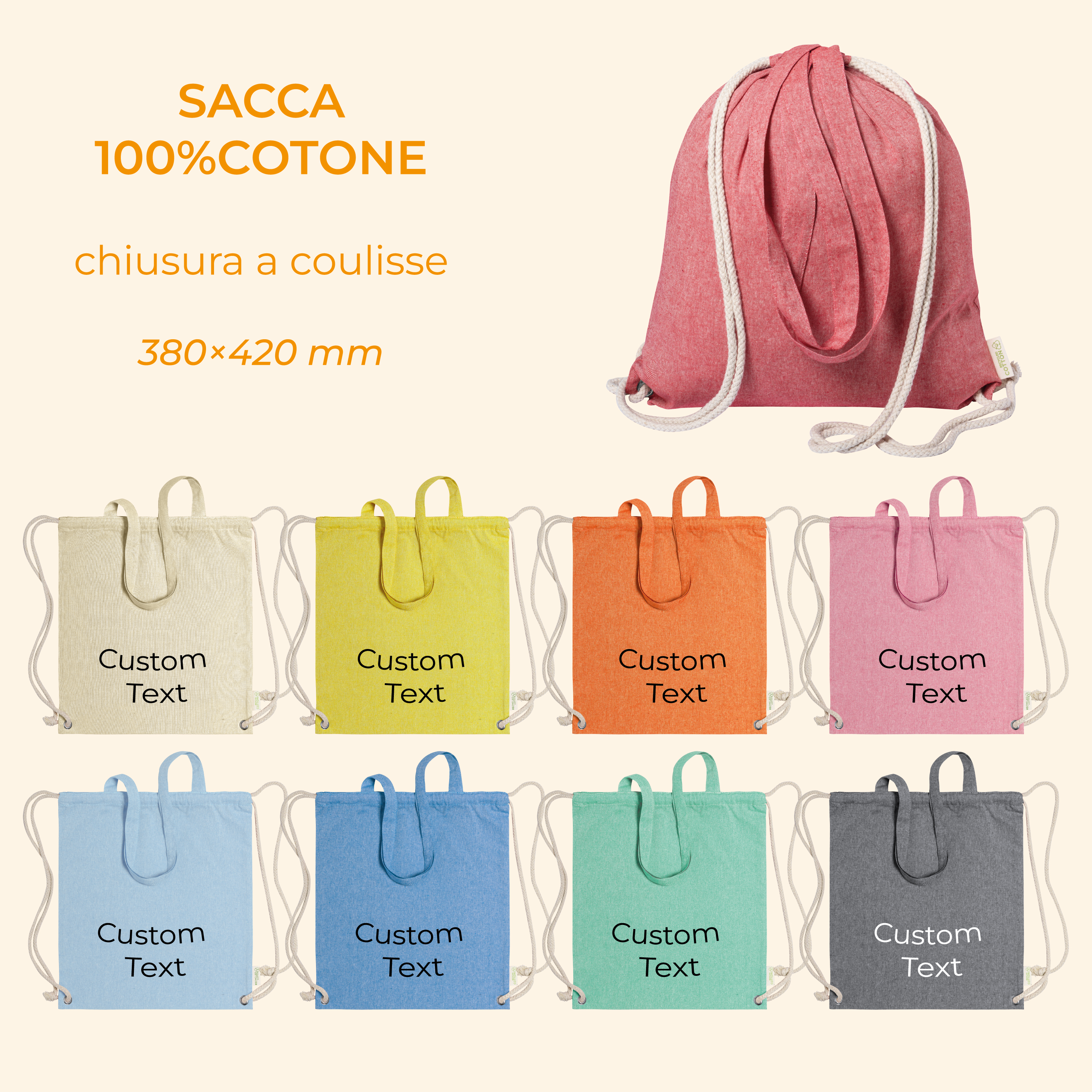 Sacca/Zaino HOLBERY 100% Cotone con Chiusura a Coulisse e Lunghi Cordoncini Personalizzata