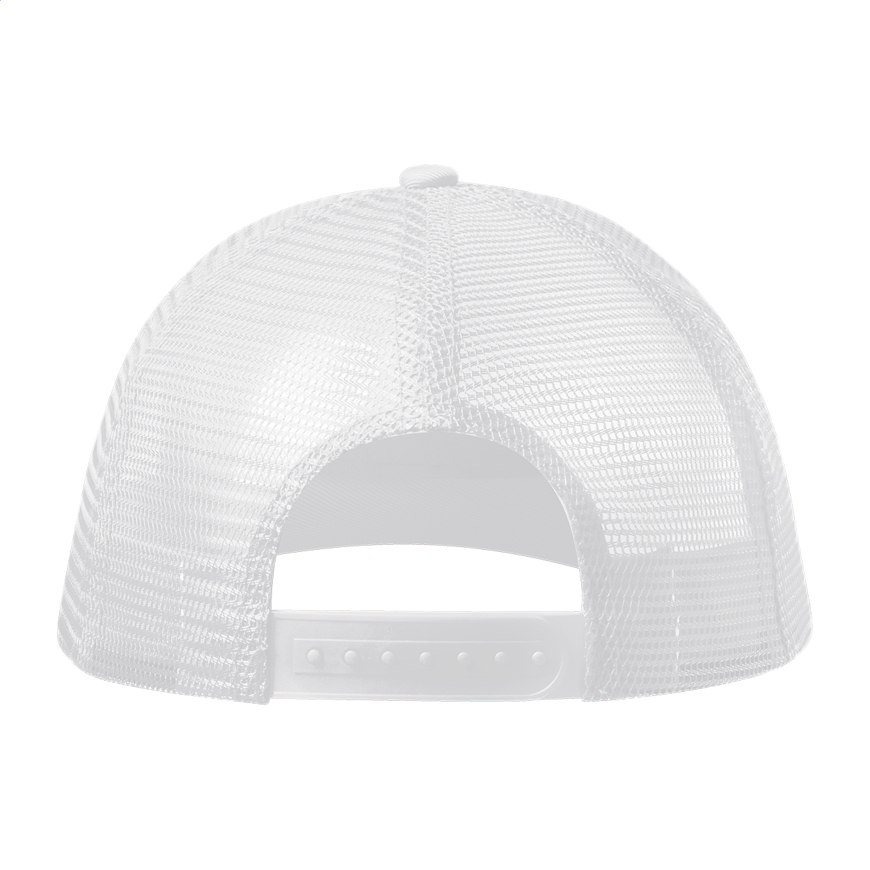 Cappellino in poliestere a 5 pannelli con parte posteriore in rete e cinturino di plastica per la regolazione della taglia.