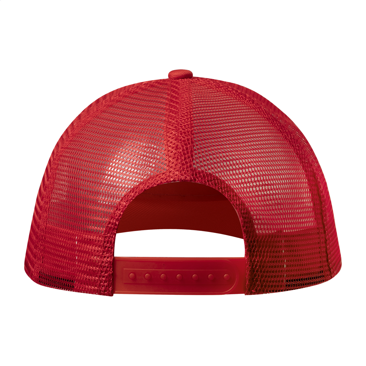 Cappellino in poliestere a 5 pannelli con parte posteriore in rete e cinturino di plastica per la regolazione della taglia.