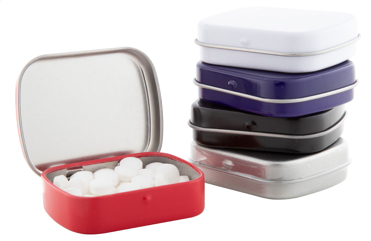 Scatola rettangolare in latta con circa 25 grammi di caramelle alla menta.
