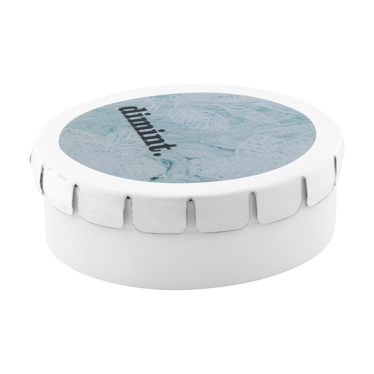 Scatola rotonda in plastica contenente circa 12 grammi di caramelle alla menta, con coperchio in latta di facile apertura.