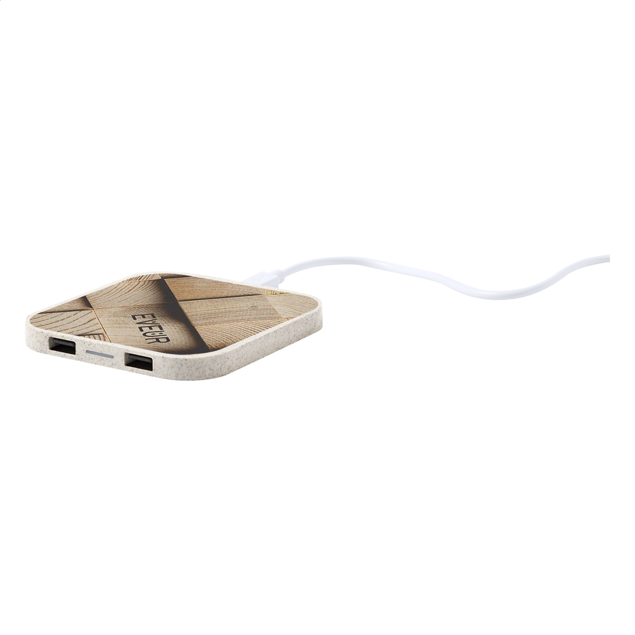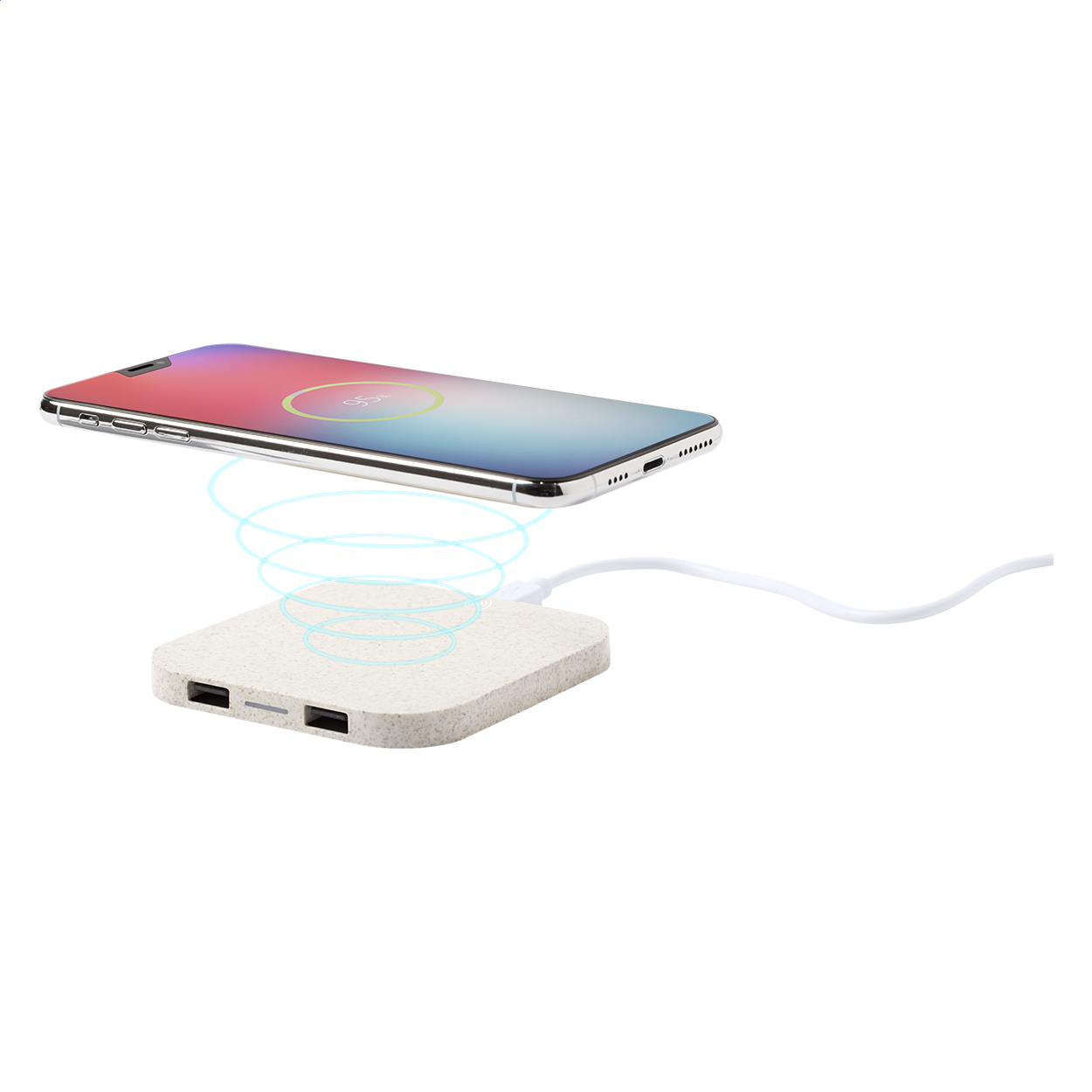 Caricabatterie wireless (10W), corpo in plastica ecologica di paglia di grano con 2 porte USB. Uscita massima 2100 mA. Cavo USB incluso.