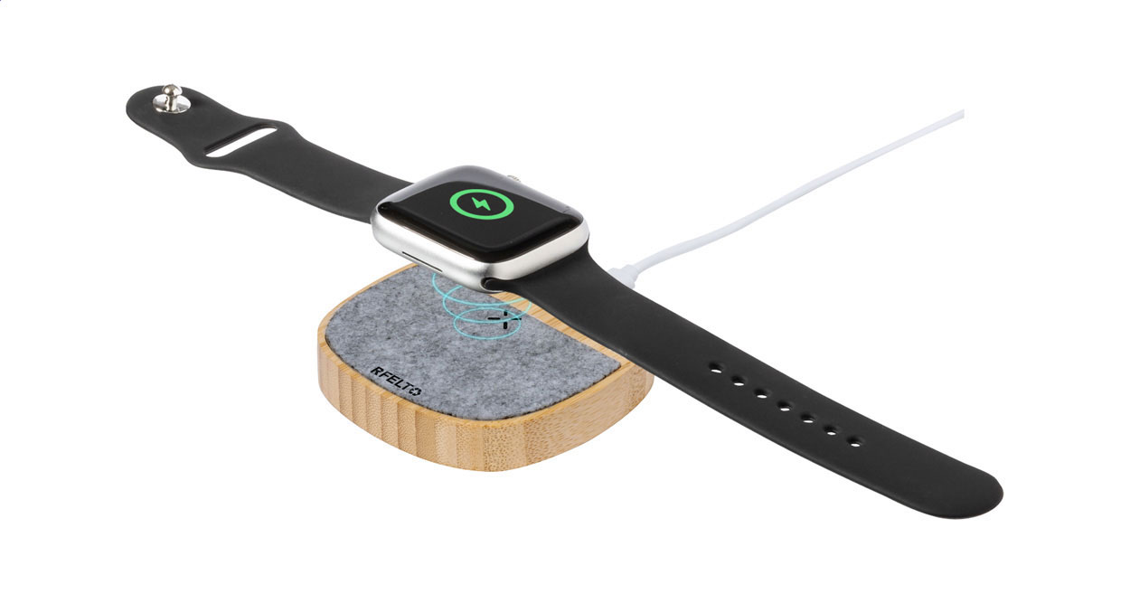 Caricabatterie rapido wireless (15W), corpo in bambù e feltro RPET. Dotato di 1 porta di ricarica USB e 1 USB-C per la ricarica simultanea via cavo e wireless. Fornito con cavo di ricarica USB.