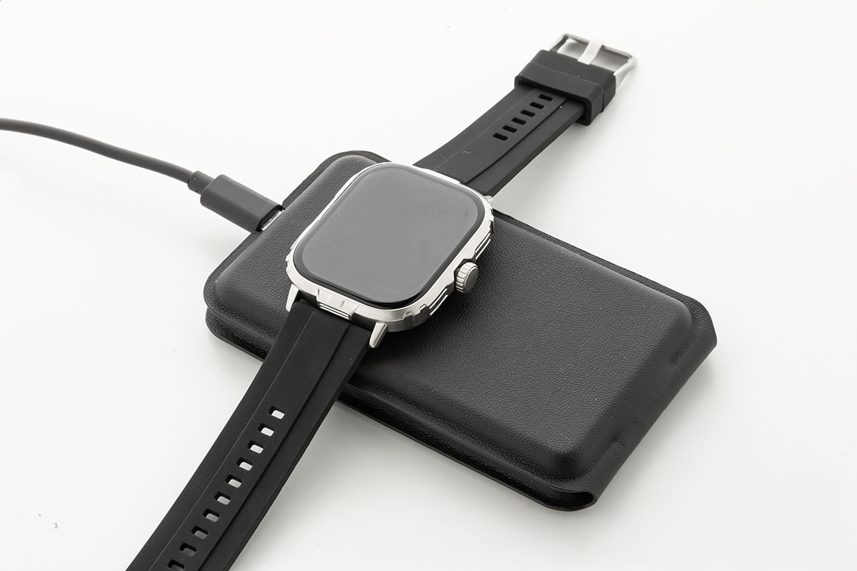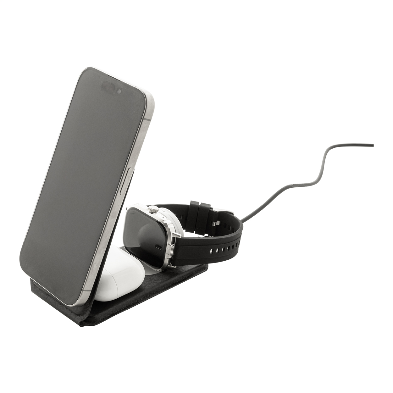 Elegante portacellulare pieghevole e set di caricabatterie wireless in pelle PU riciclata. Con caricatore rapido wireless magnetico (15W), caricatore wireless (5W) per auricolari (solo Apple®) e caricatore wireless (2,5W) per smart watch (Apple® e Samsung®). Compreso anello metallico autoadesivo che consente di utilizzare la funzione magnetica su qualsiasi dispositivo ricaricabile in modalità wireless. Compatibile con iPhone® 12 o più recente. Cavo di ricarica USB incluso