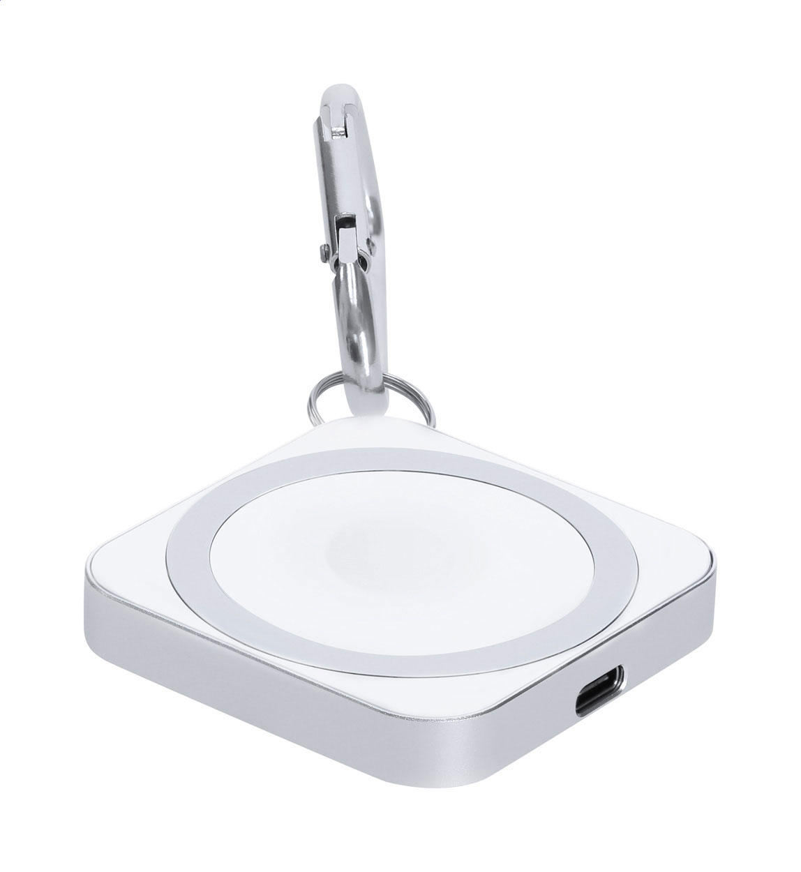Rapido caricabatterie magnetico wireless (15W) corpo in alluminio e moschettone. Progettato per ricaricare smartphone, auricolari e smartwatch. Compatibile con iPhone® 12 o più recente.