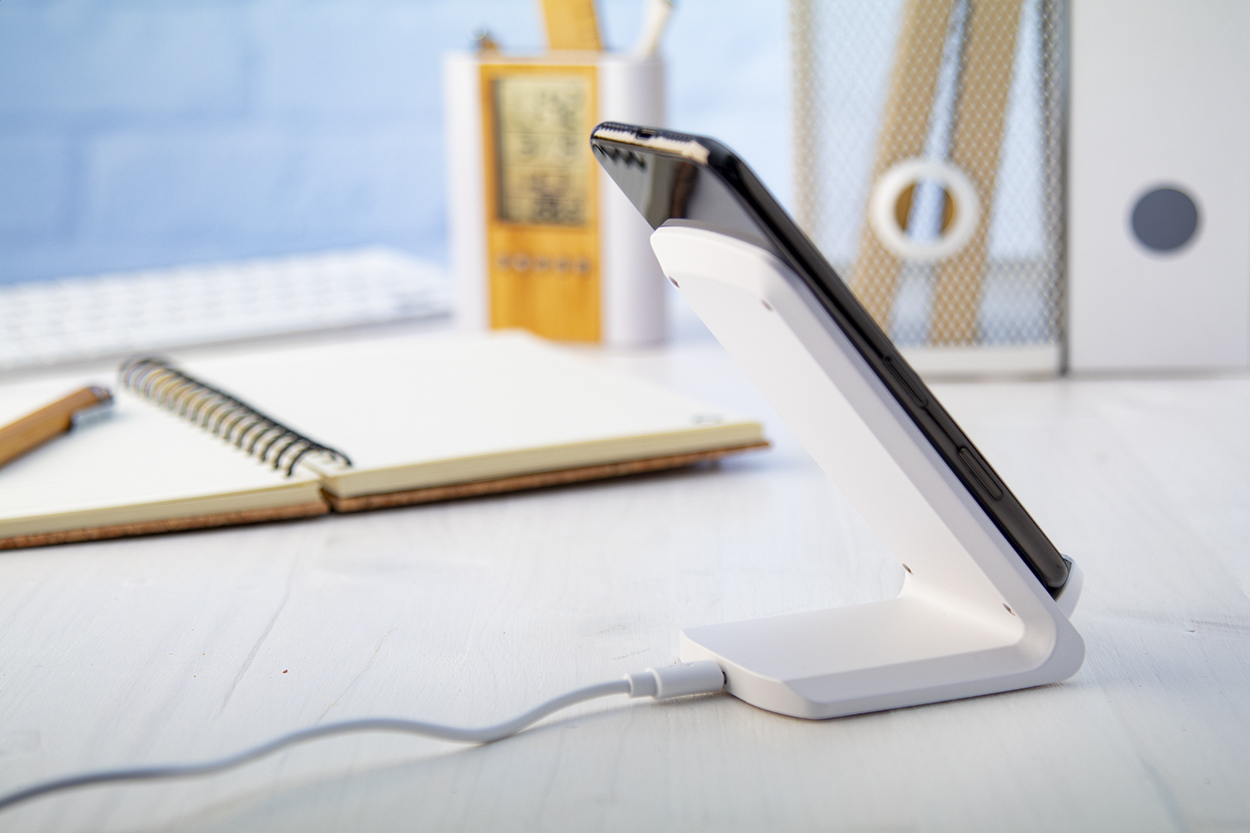 Supporto cellulare da scrivania in plastica con caricatore rapido wireless incorporato (10W). Cavo di ricarica USB incluso.