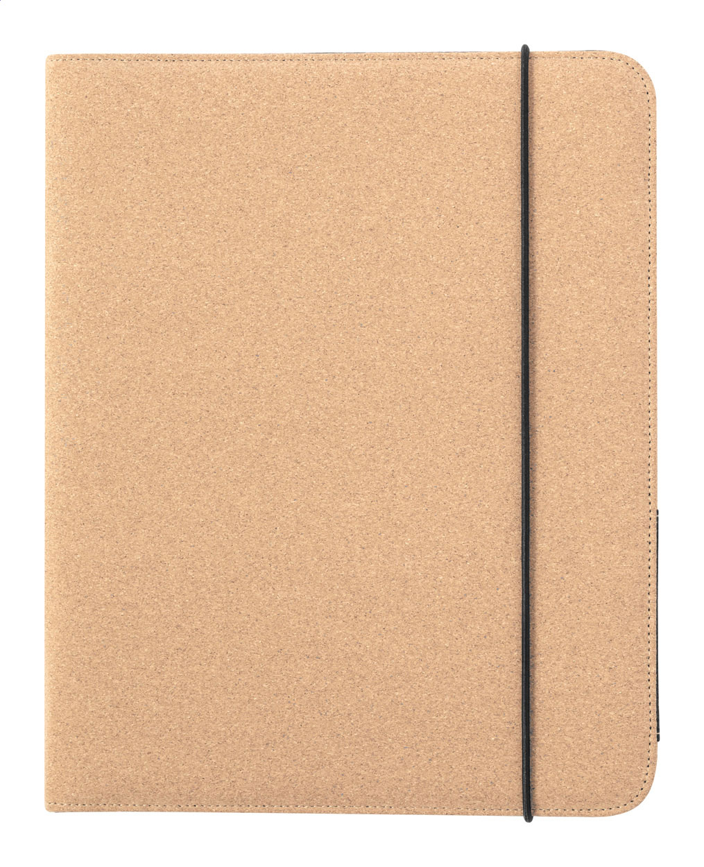 Cartella portadocumenti in sughero naturale con blocco note da 20 fogli a righe e multiple tasche interne.