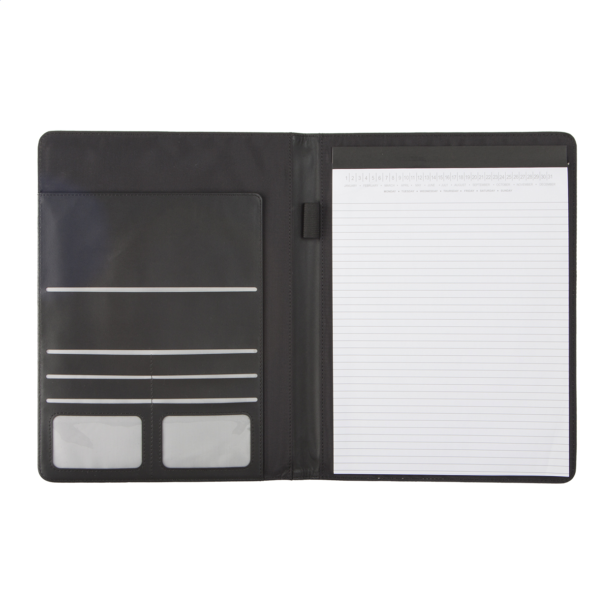 Cartella formato A4 in PU, con blocco da 20 pagine a righe, penna e portabiglietti da visita.