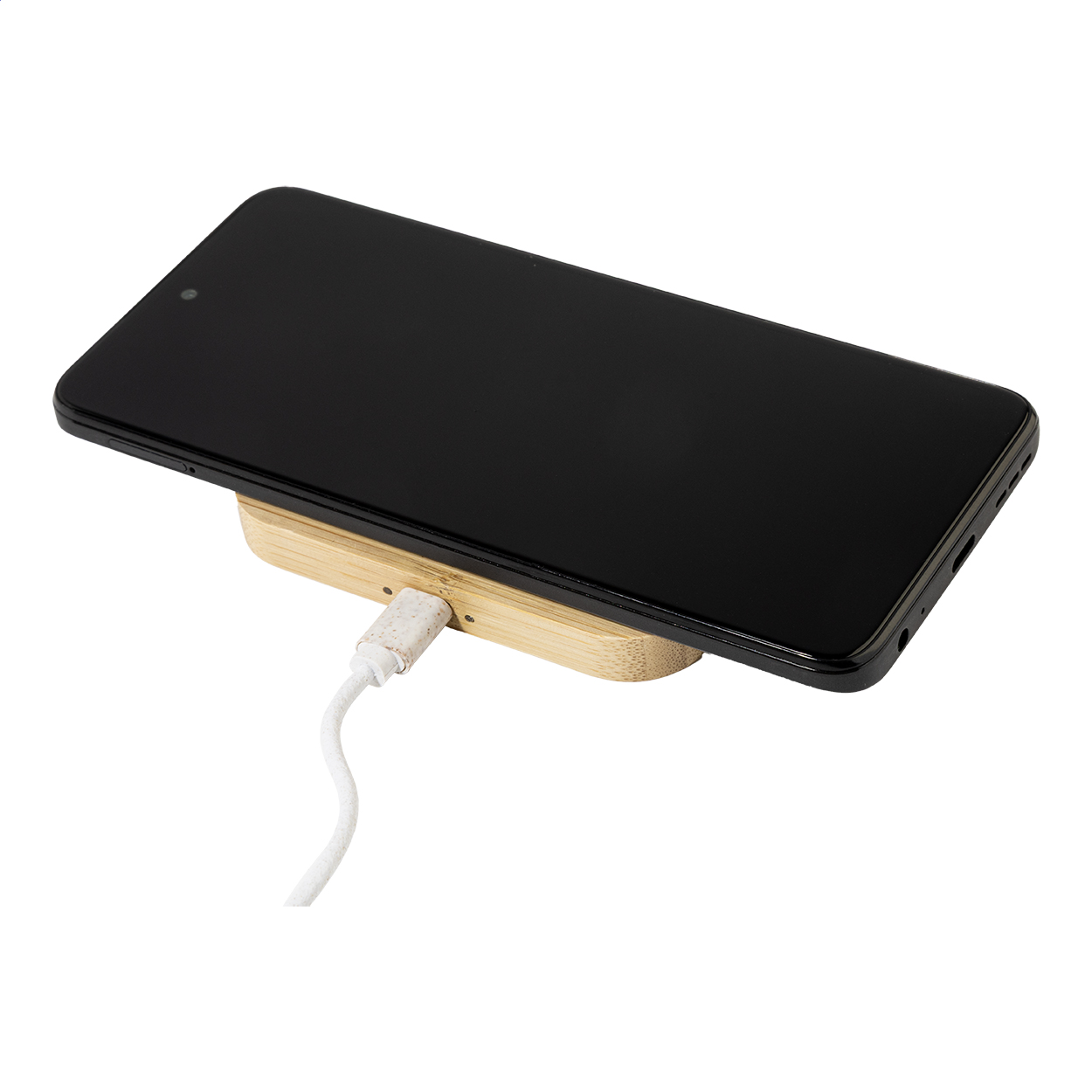 Set cavi di cavi USB in plastica ecologica di paglia di grano e caricatore rapido wireless (15W), contenuti in una custodia magnetica in bambù e cinturino. Il set comprende cavo USB-C con adattatori USB, micro USB e Lightning.
