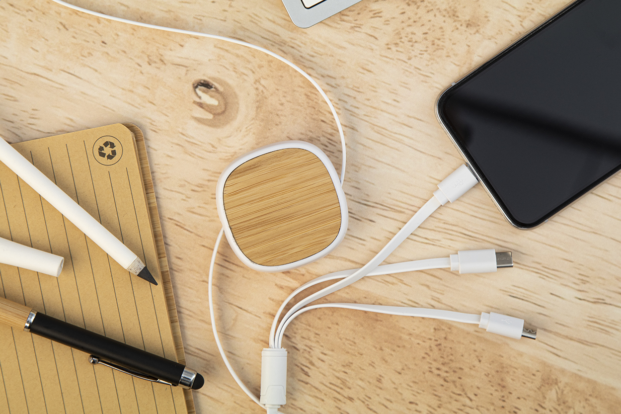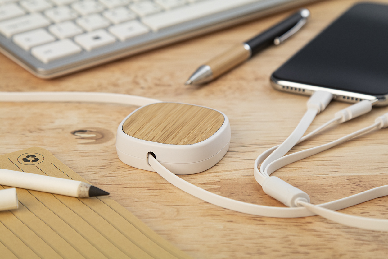 Cavo USB telescopico per caricabatterie in ABS riciclato e bambù. Con connettori micro USB, USB-C e Lightning ed ingressi USB e USB-C.
