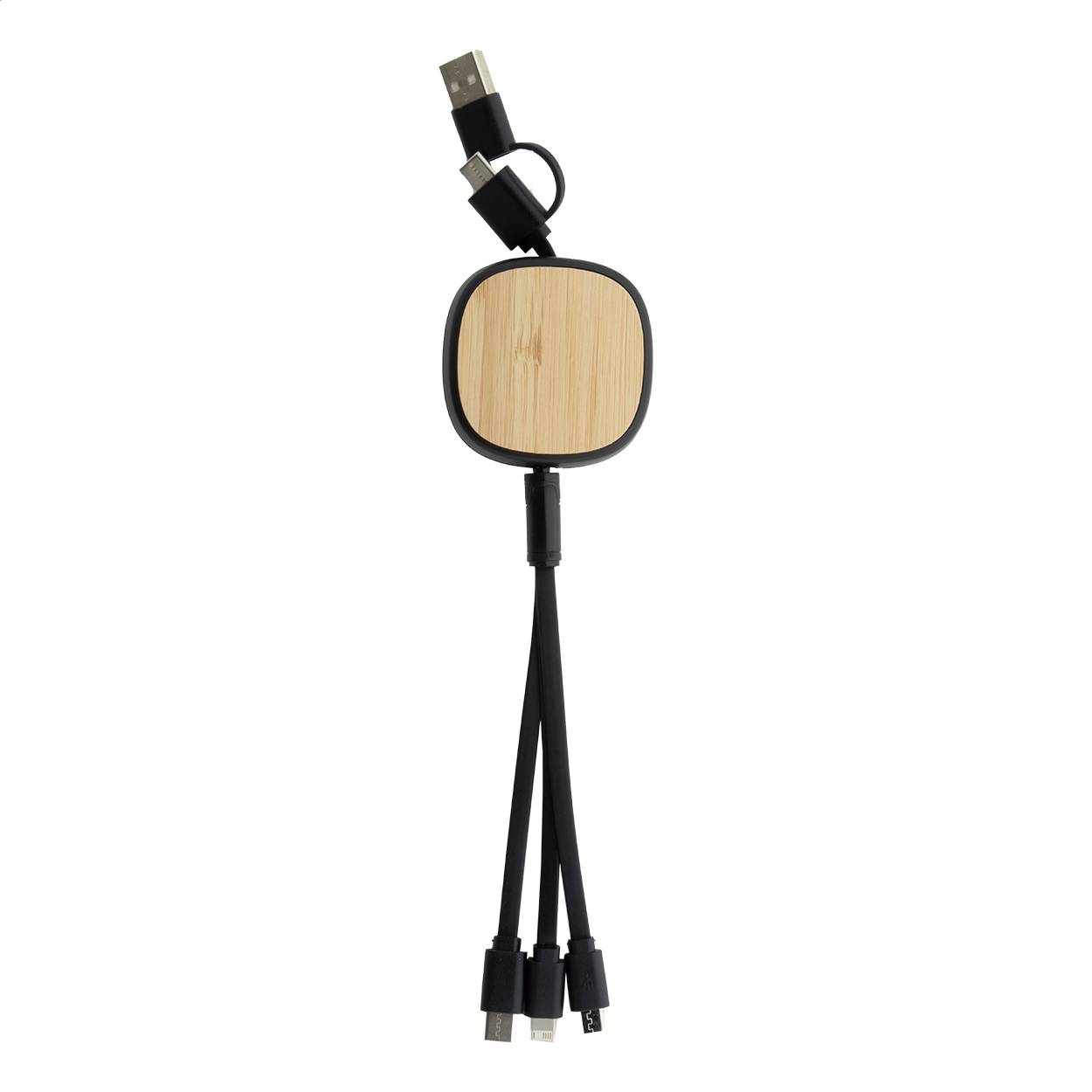 Cavo USB telescopico per caricabatterie in ABS riciclato e bambù. Con connettori micro USB, USB-C e Lightning ed ingressi USB e USB-C.
