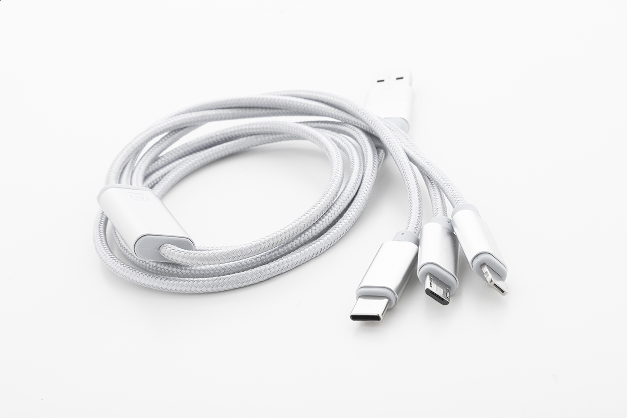 Cavo di ricarica USB in alluminio riciclato e RPET con connettori micro USB, USB-C e Lightning ed ingressi USB e USB-C. Lunghezza del cavo: 100 cm.