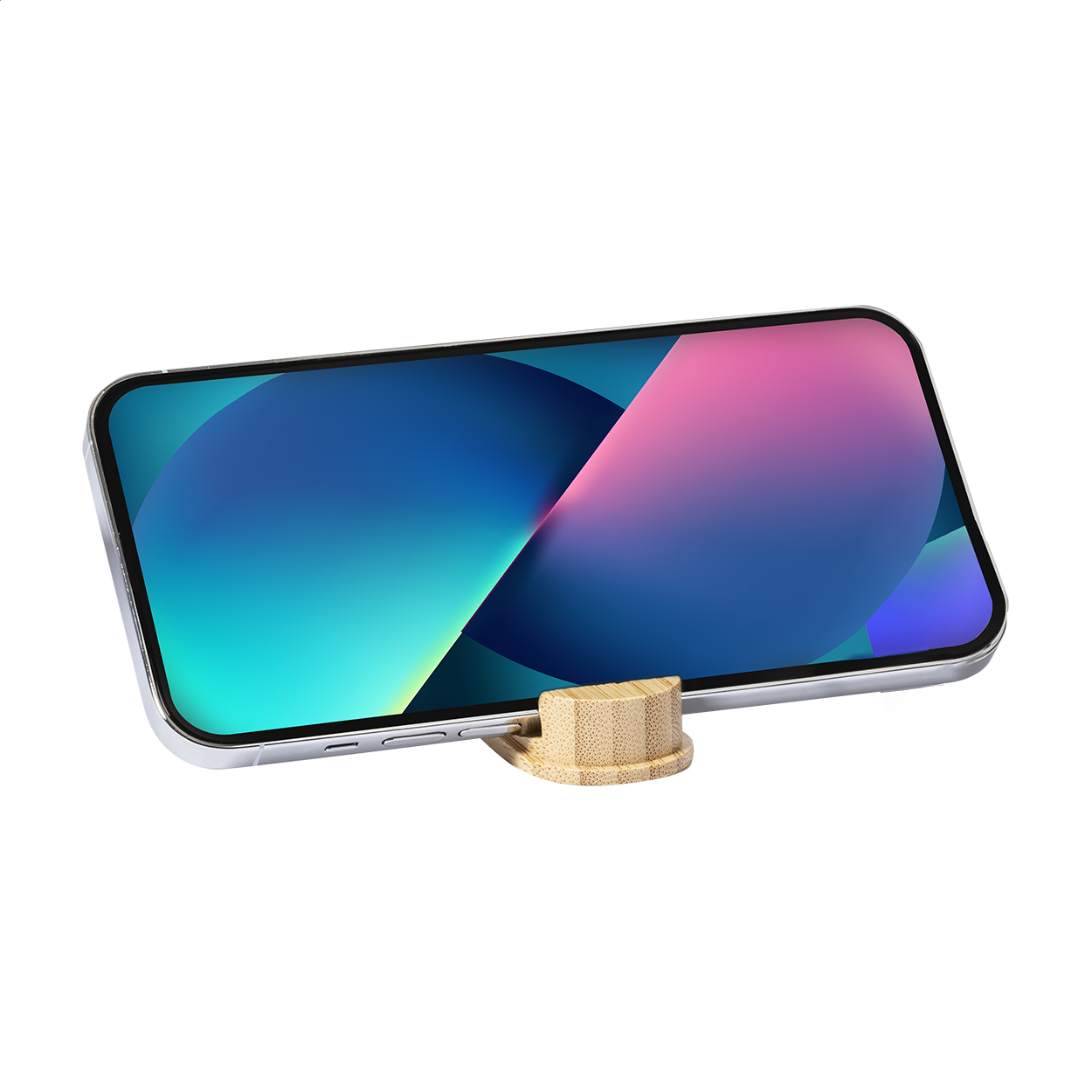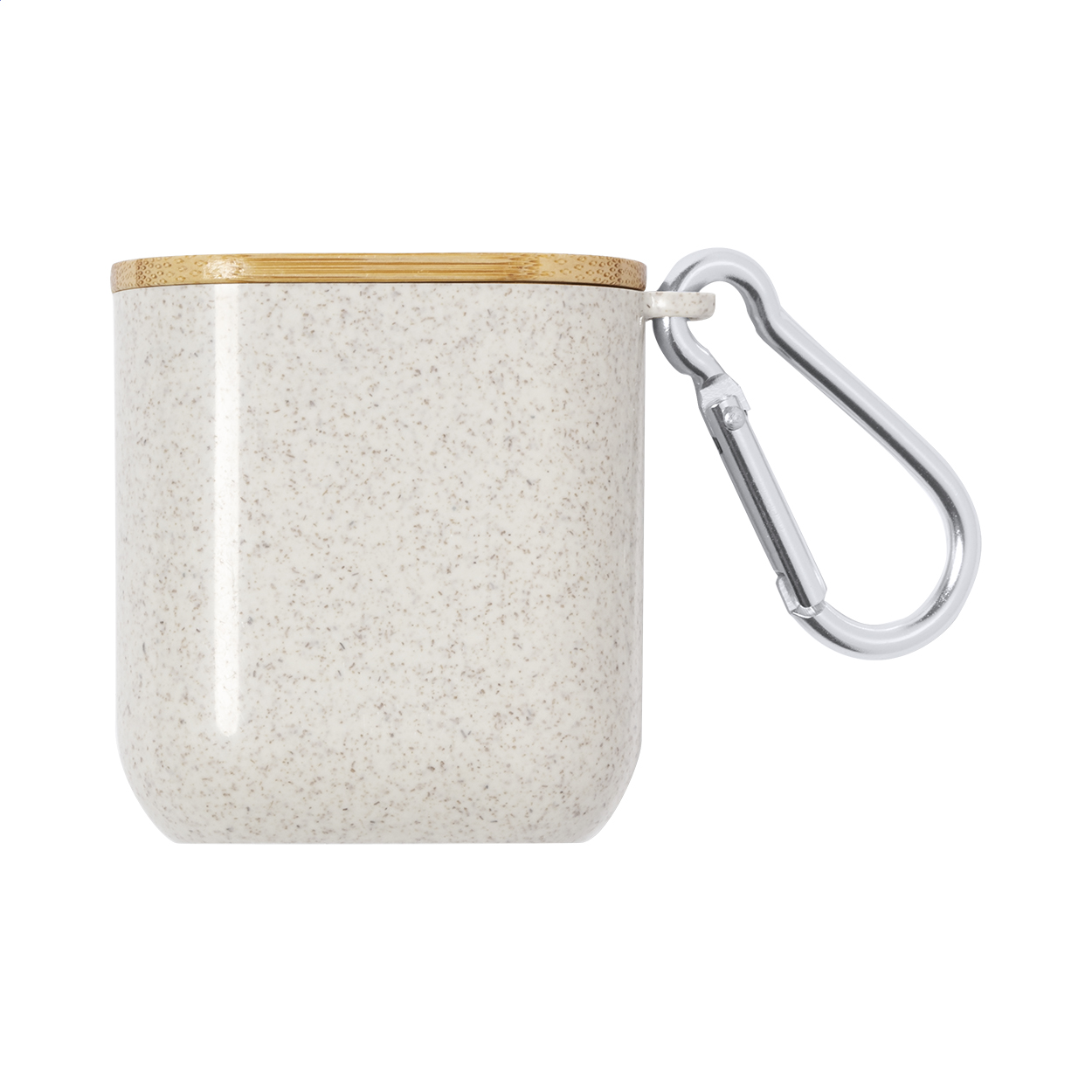 Cavo di ricarica USB in astuccio di plastica ecologica in paglia di grano con moschettone e coperchio portacellulare in bambù. Con connettori micro USB, USB-C, Lightning ed ingressi USB e USB-C.