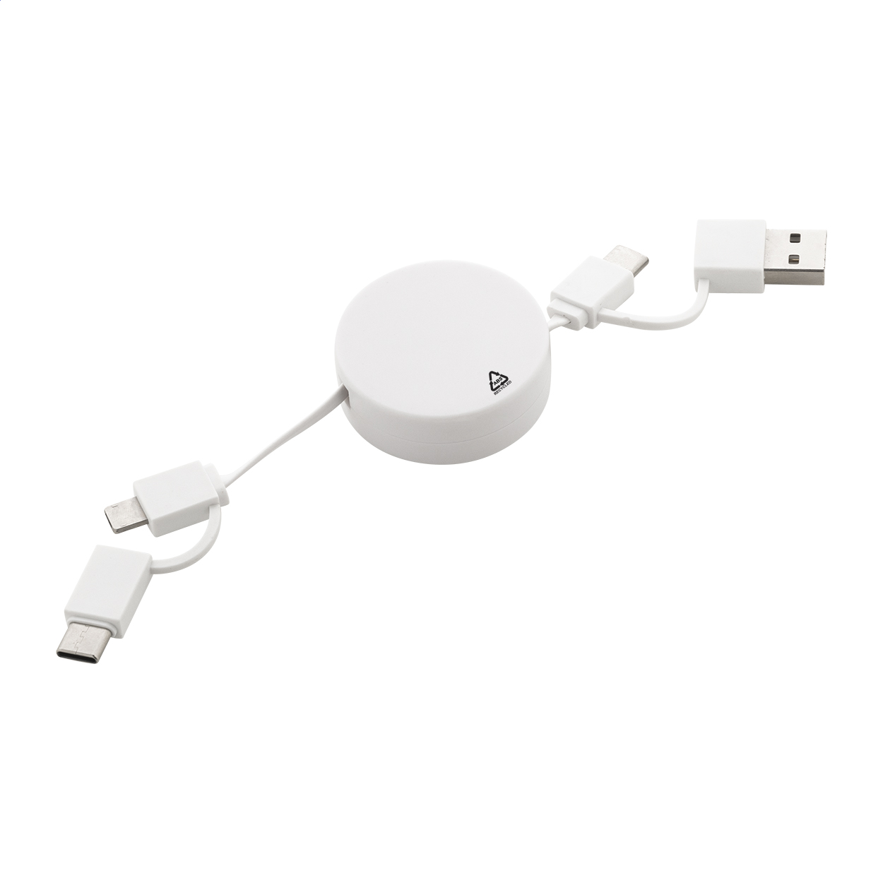 Cavo di ricarica USB telescopico in ABS riciclato con connettori micro USB, USB-C, Lightning ed ingressi USB e USB-C.