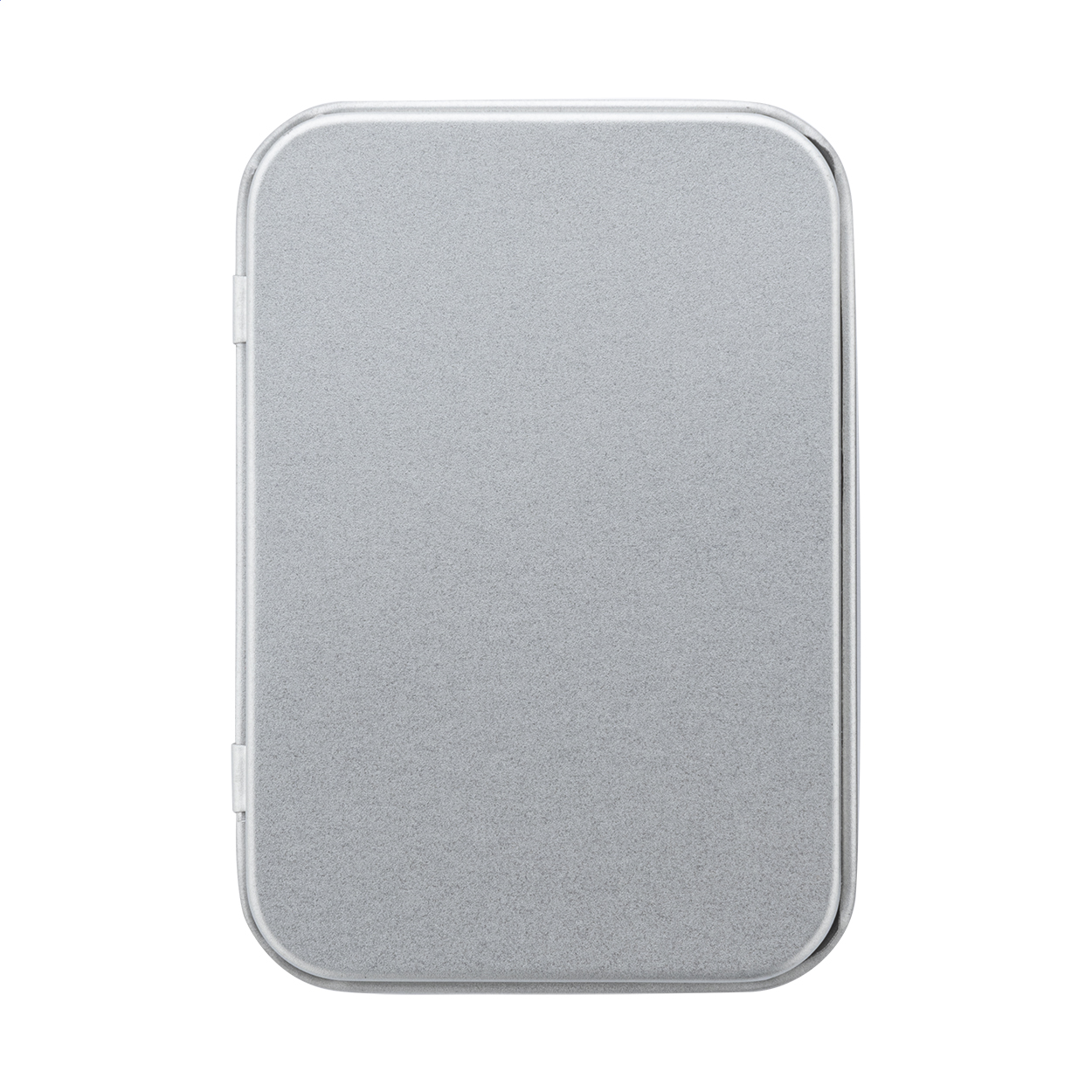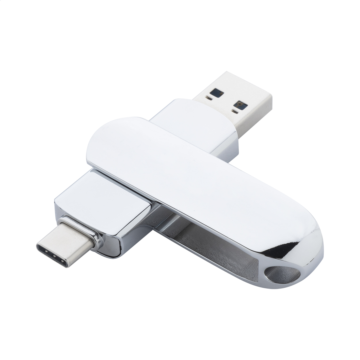 Chiavetta USB 2.0 Twist OTG in metallo e memoria da 16/32 GB. Provvista di connessioni USB e USB-C e confezionata in scatola di latta.