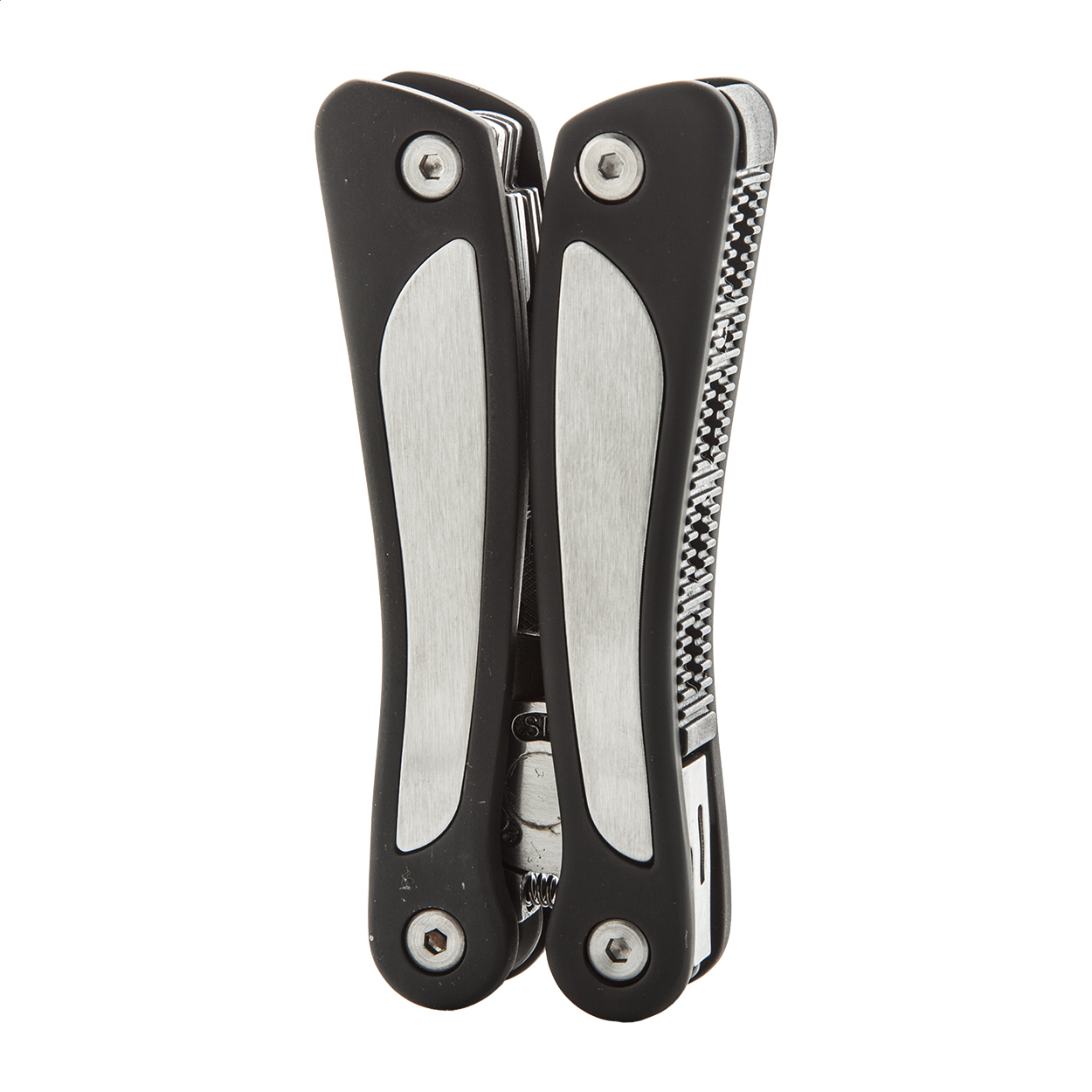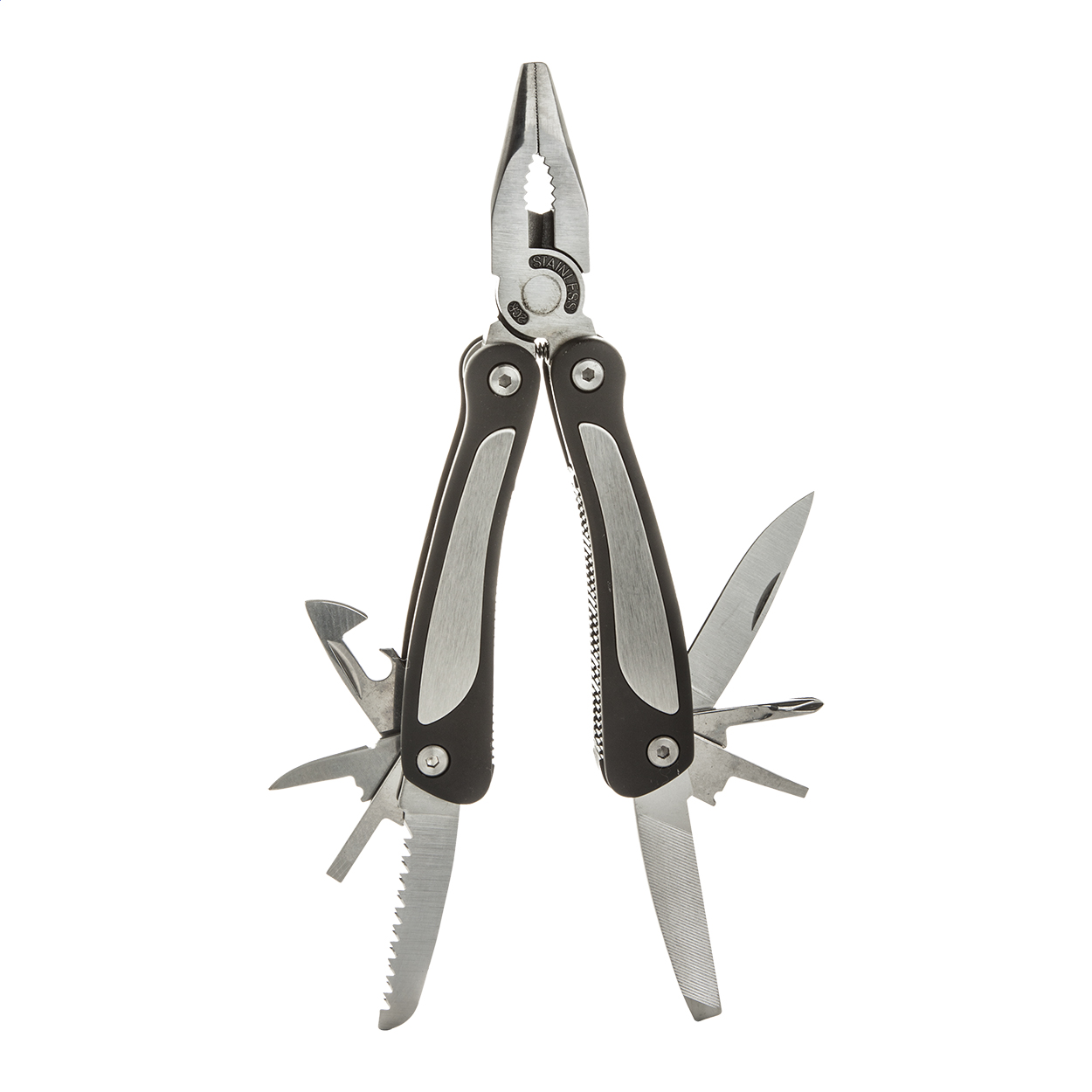 Pinza multiuso in acciaio 9 funzioni: pinze, lima per unghie, 3 cacciaviti, 2 coltelli, apriscatole con custodia in poliestere.