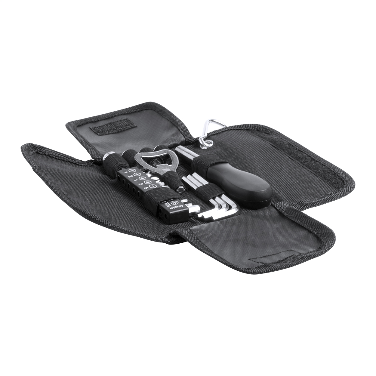 Set 19 attrezzi con custodia di poliestere e moschettone.