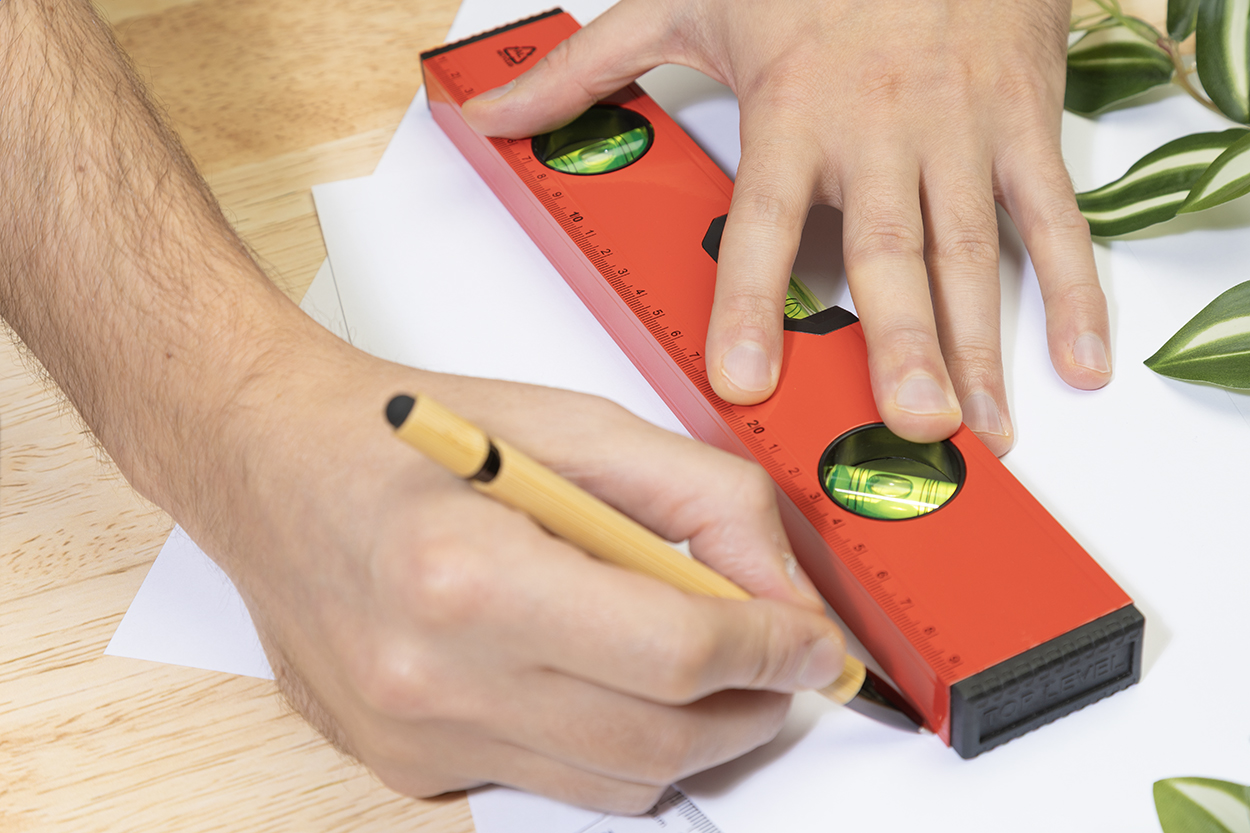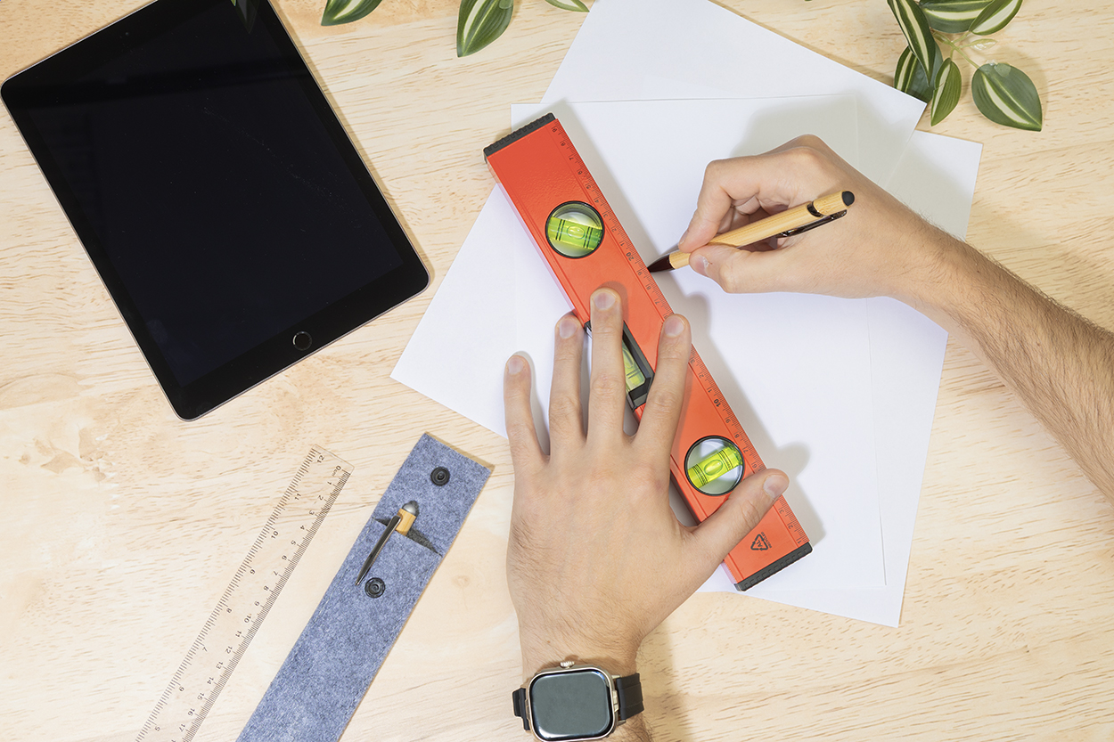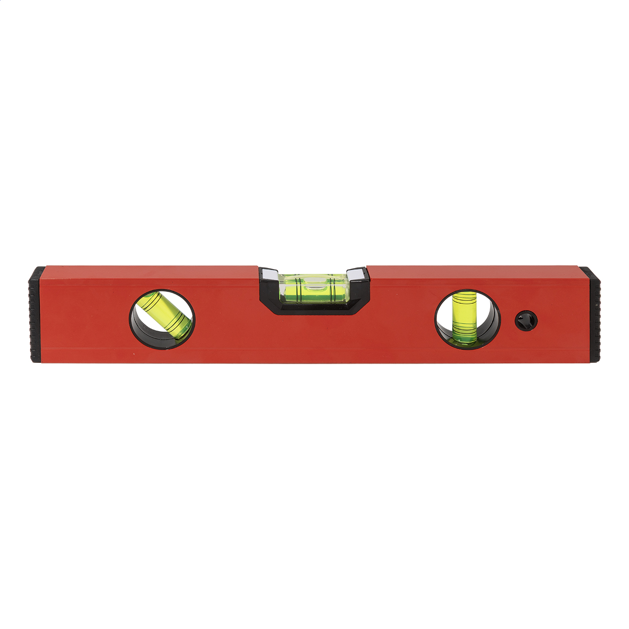 Tripla livella magnetica (orizzontale, verticale e a 45°) in alluminio riciclato e righello da 30 cm.