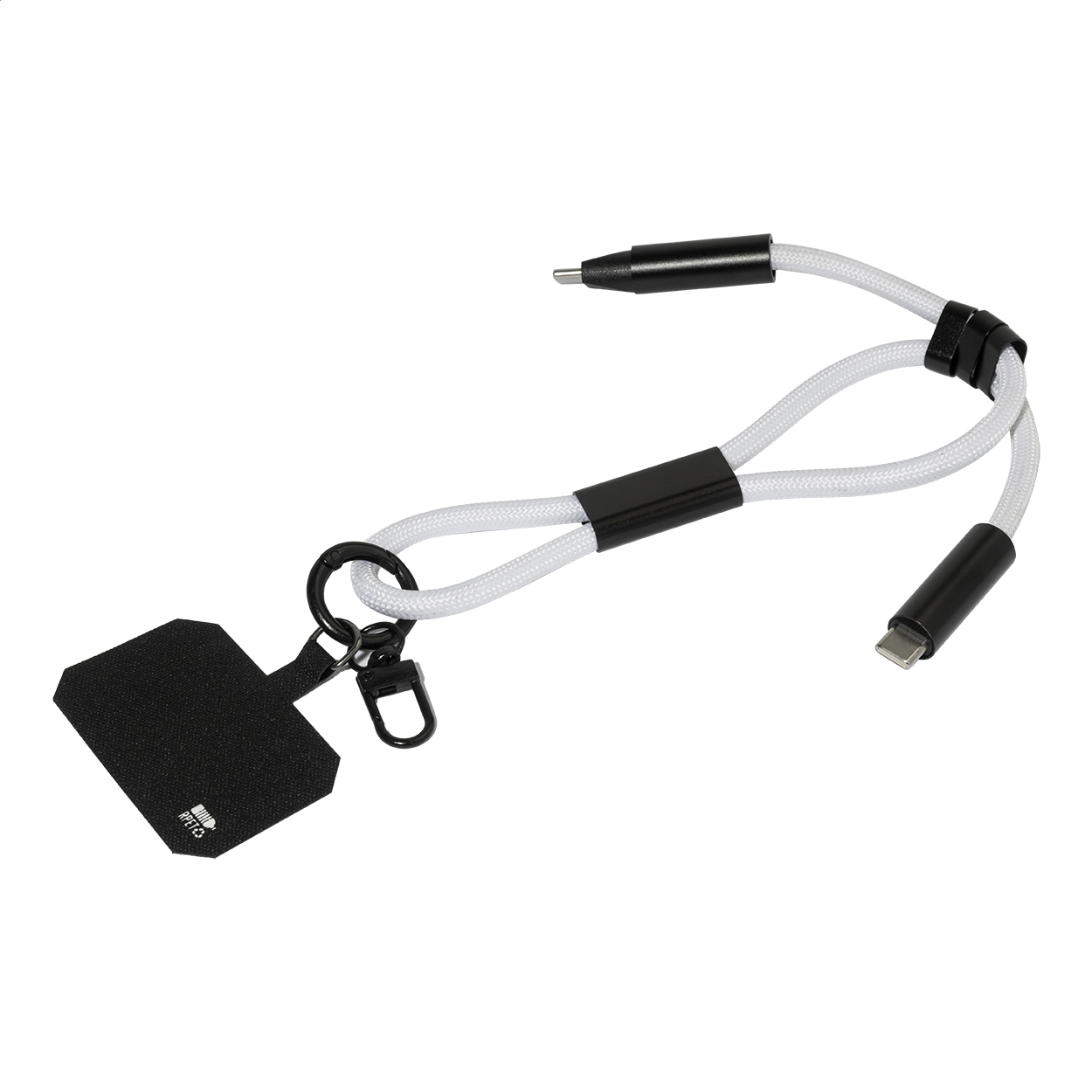 Braccialetto porta cellulare in RPET con inserto per telefono, moschettone e cavo di ricarica USB-C a USB-C integrato e connettori nascosti. Supporta la ricarica rapida PD da 60 W e il trasferimento dati.