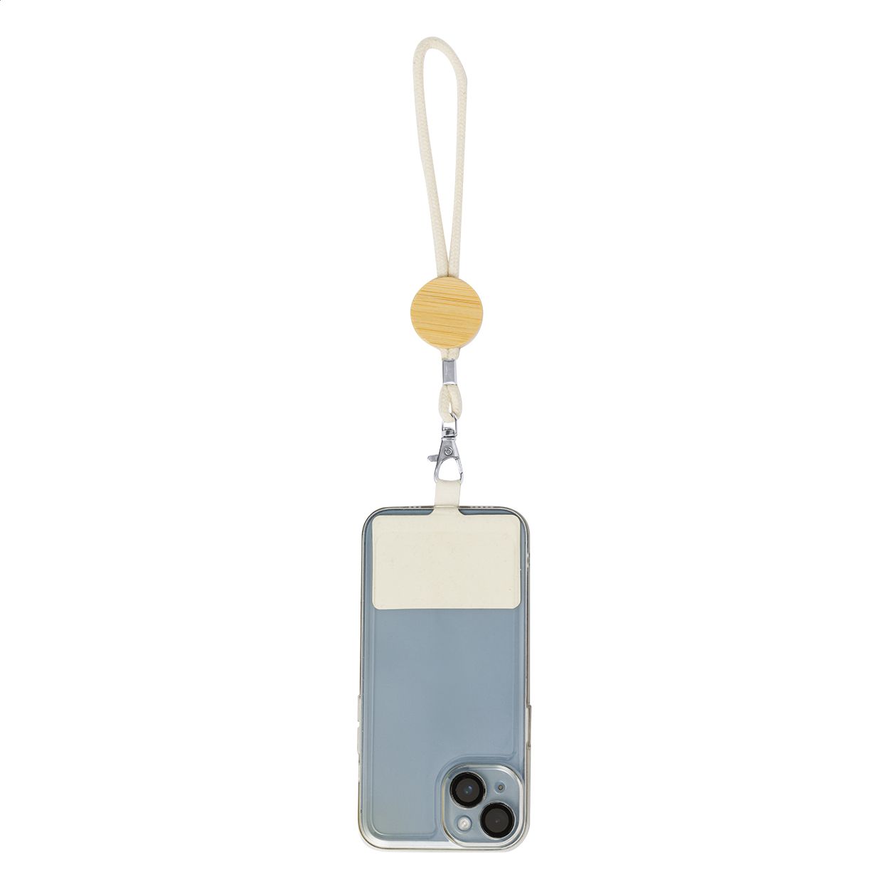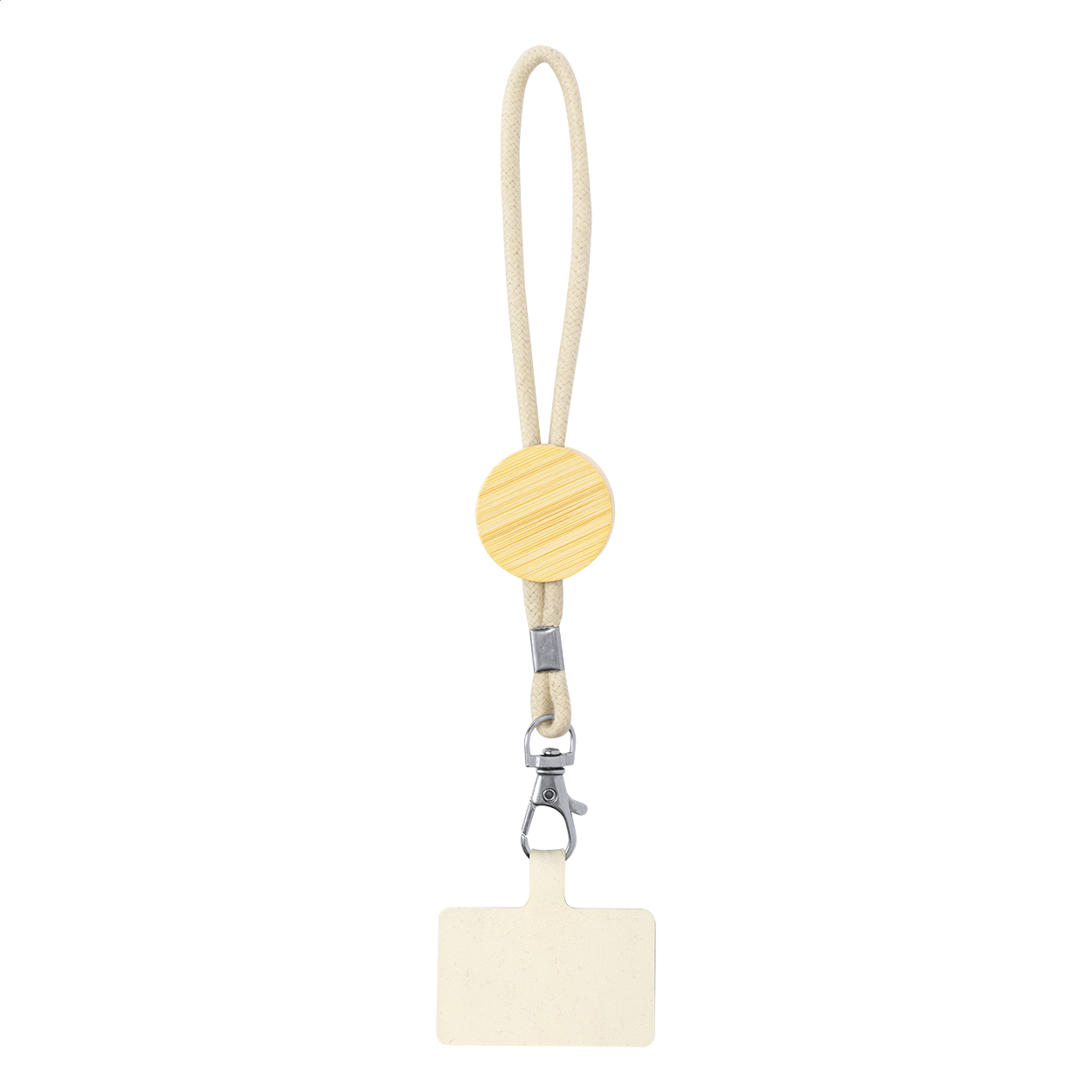 Cinturino da polso portacellulare, in cotone con piastrina rotonda in bambù, inserto per il telefono e moschettone in metallo.