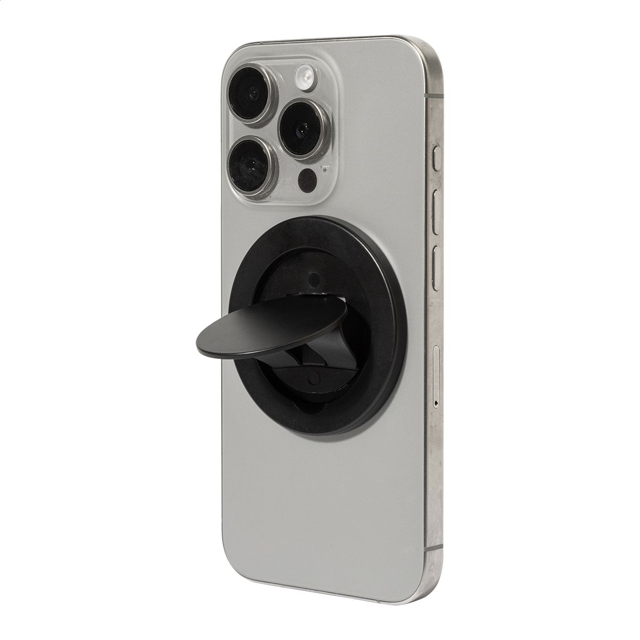 Supporto magnetico in ABS riciclato per dispositivi mobili. Include un anello metallico autoadesivo adatto a cellulari privi di superficie magnetica.