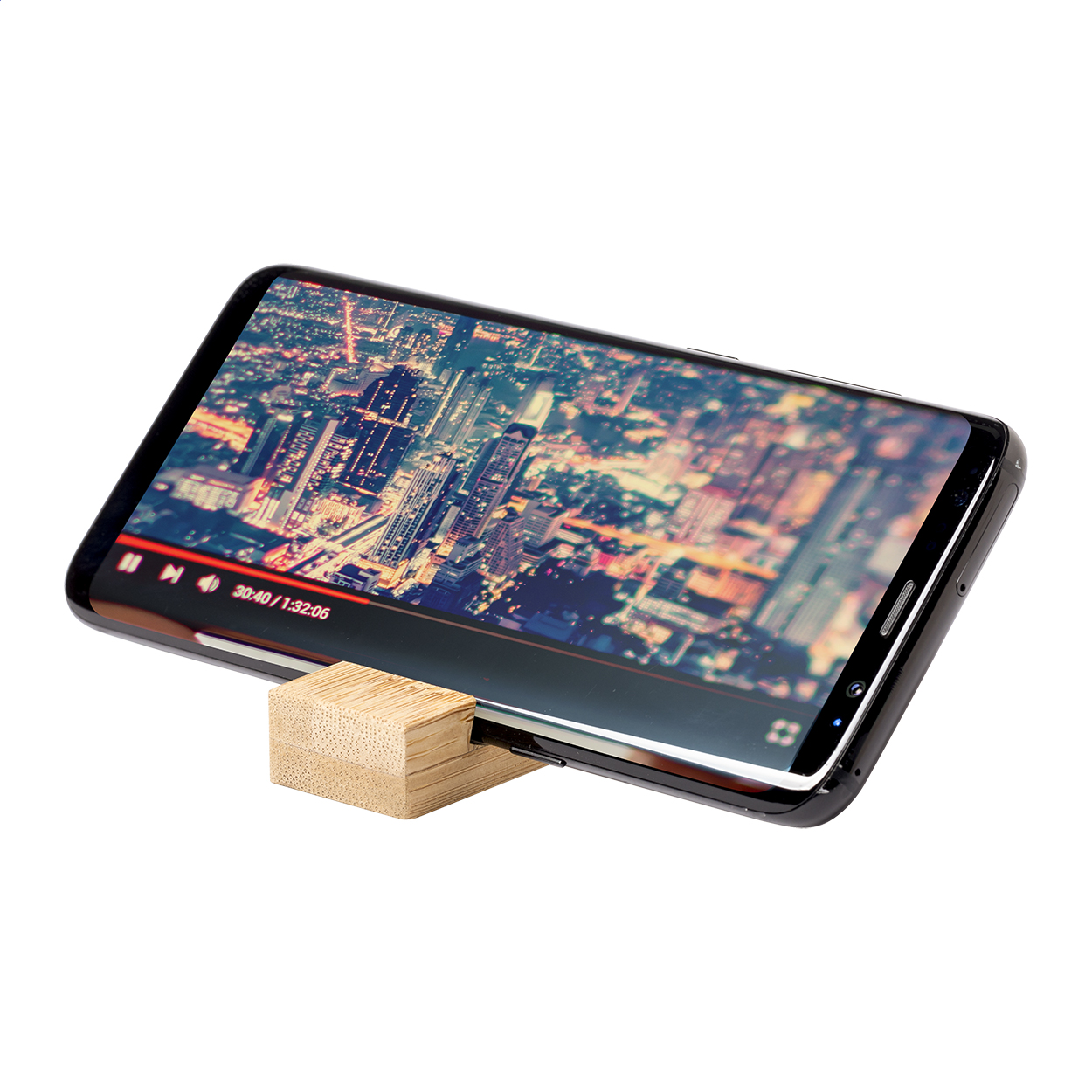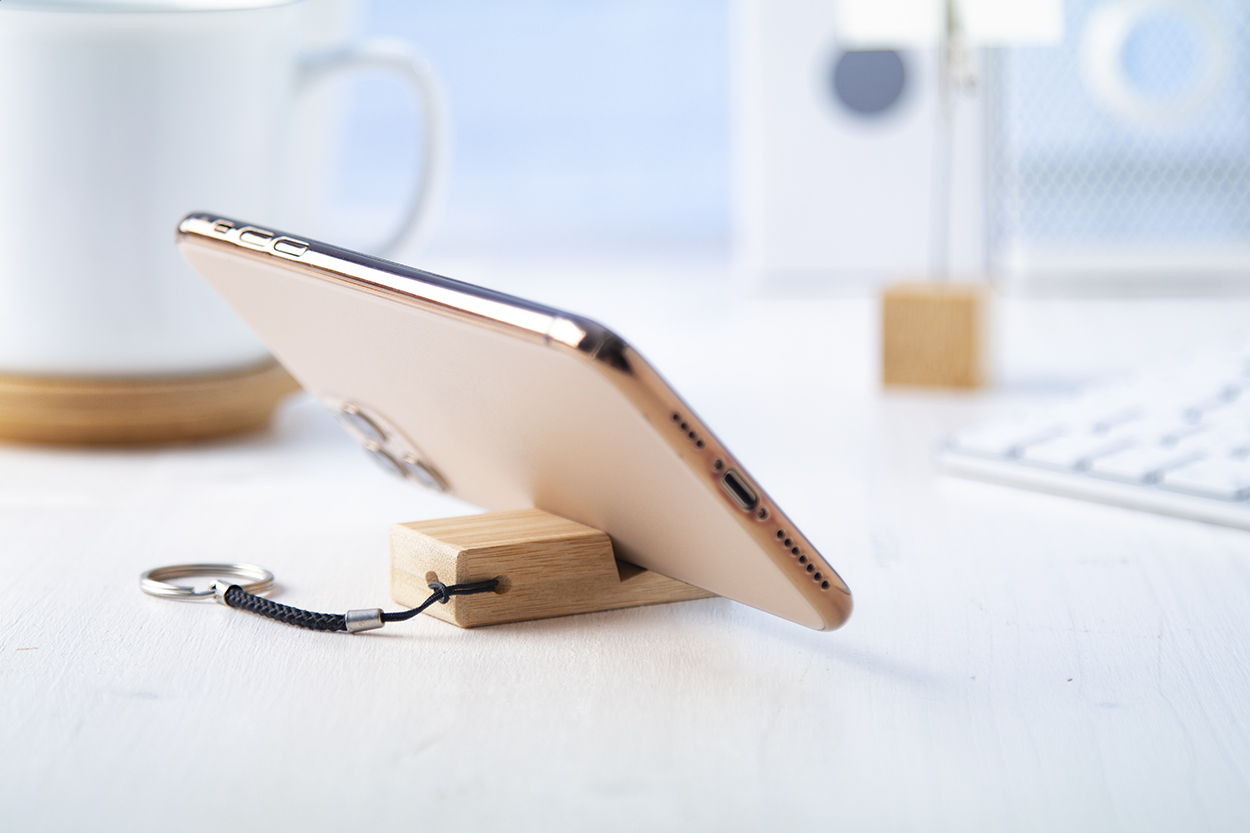 Portachiavi con supporto portacellulare in bambù ed anello metallico.