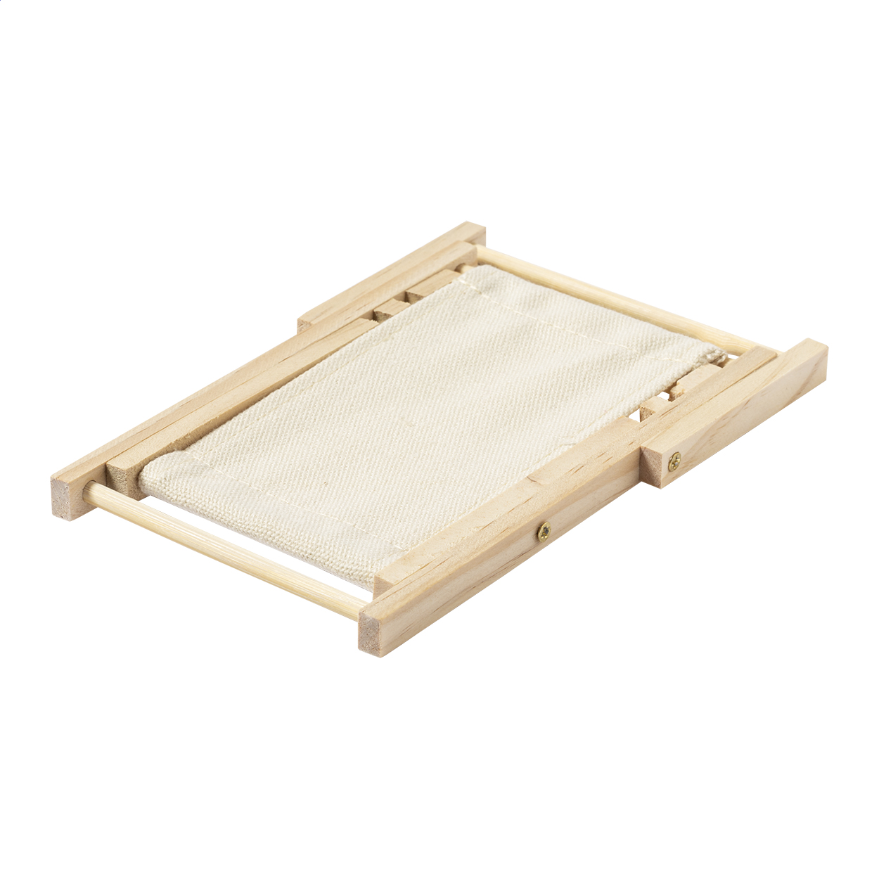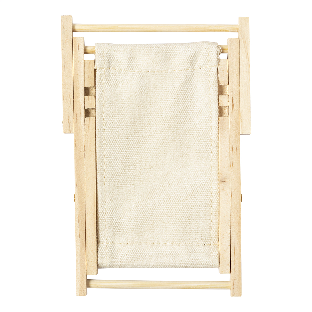Portacellulare pieghevole da tavolo a forma di sedia a sdraio in legno e cotone.