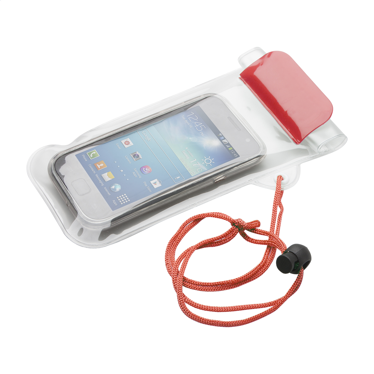 Custodia cellulare impermeabile in plastica con laccino da collo.