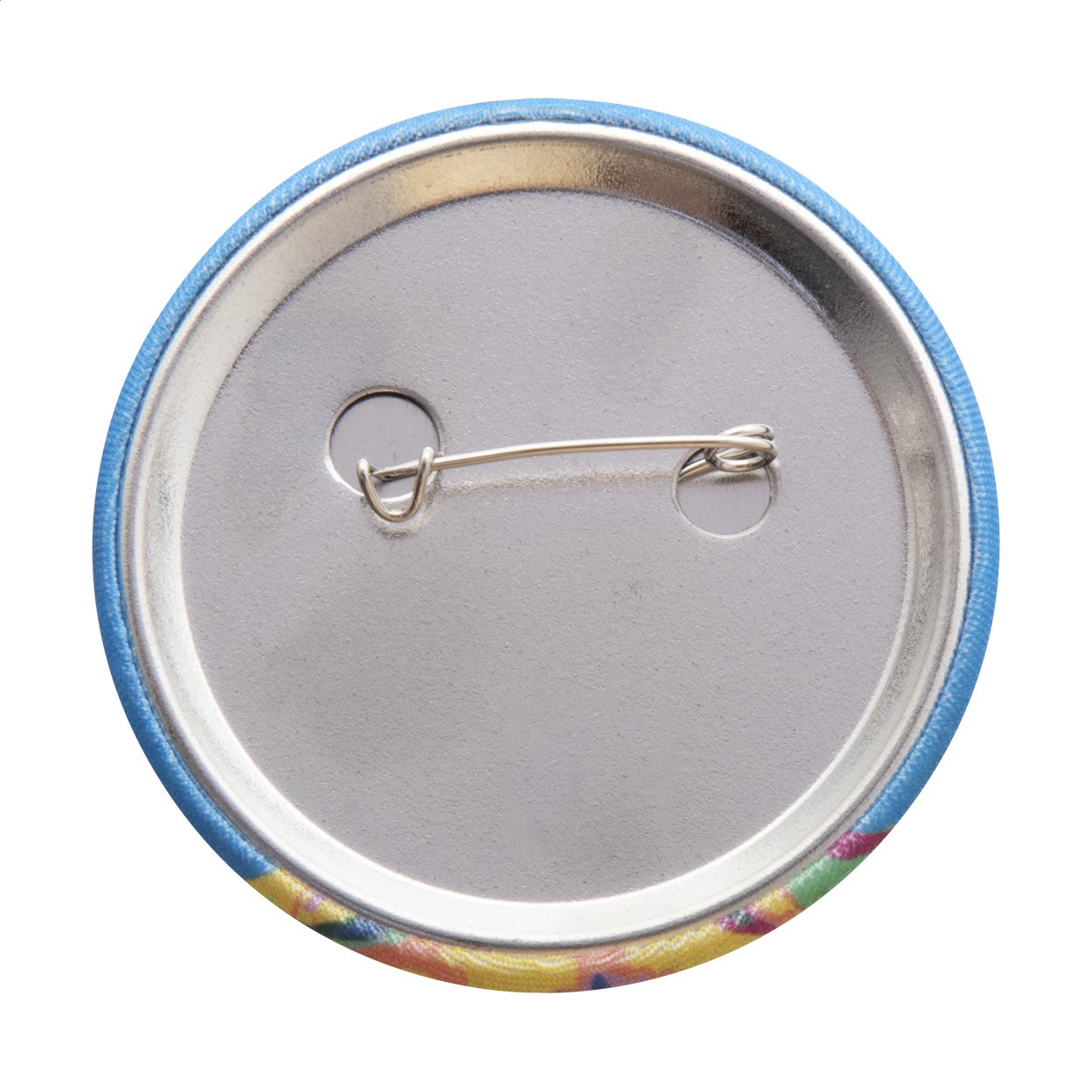 Grande spilla a bottone con inserto in poliestere RPET personalizzato con stampa a colori. Il prezzo include la stampa in sublimazione. MOQ: 100 pezzi.