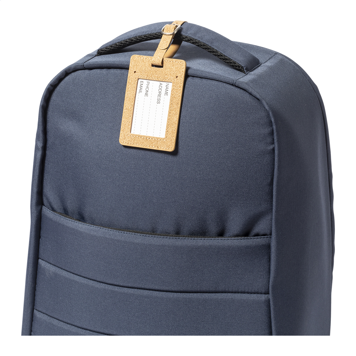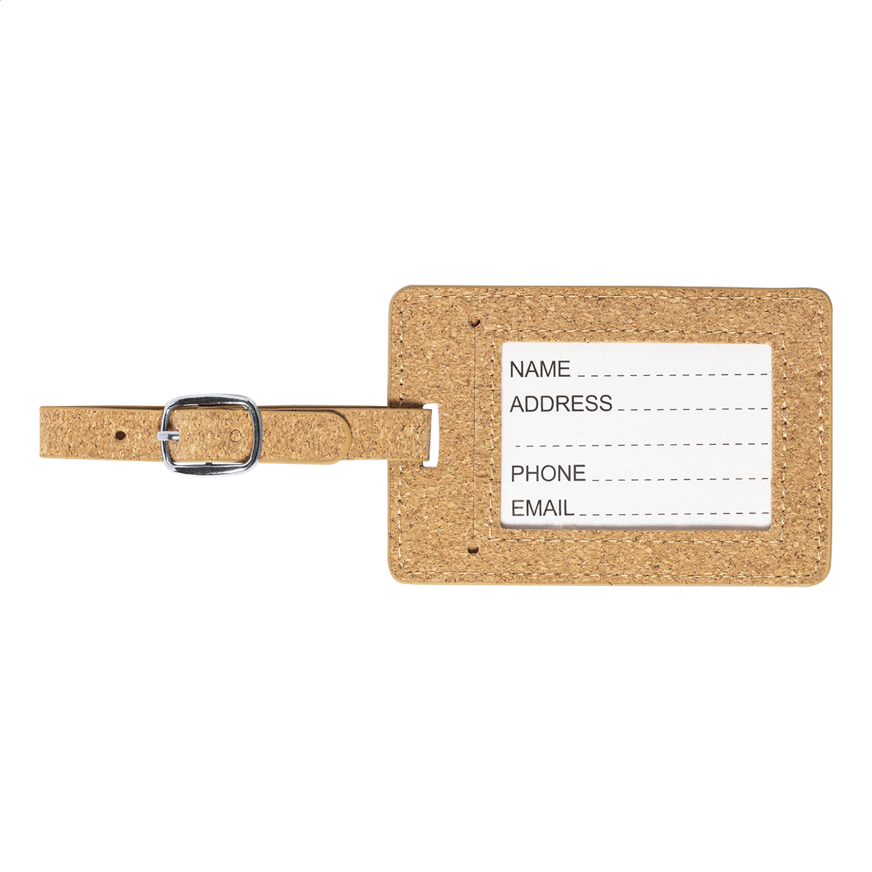 Etichetta per bagagli in sughero naturale con fibbia in metallo.