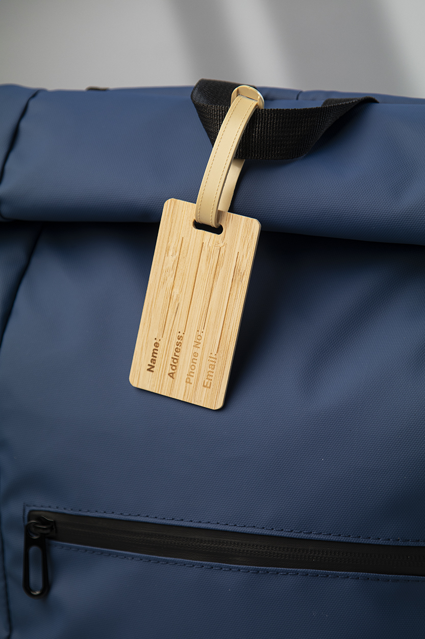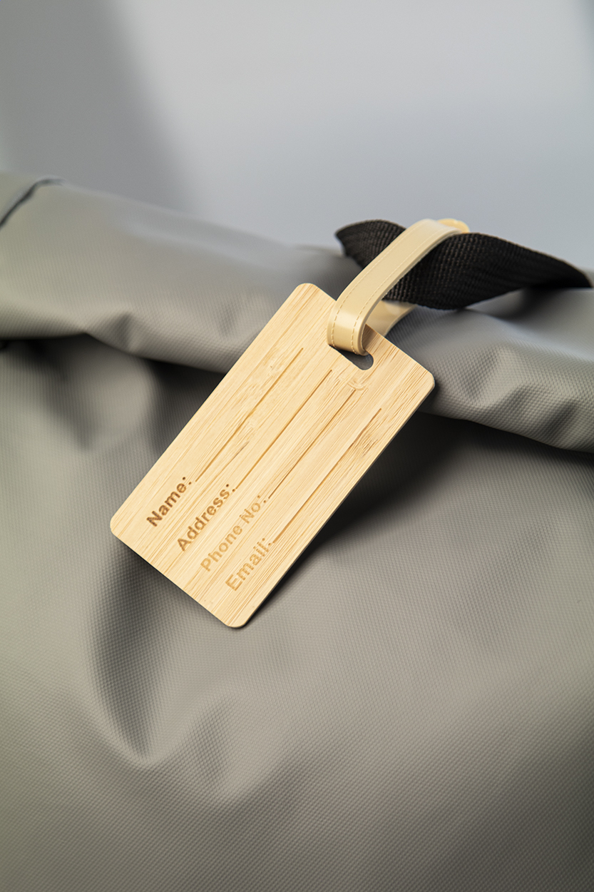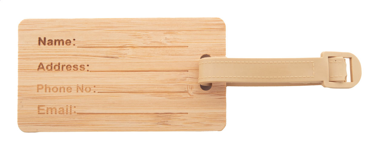 Etichetta per bagagli in bambù con laccetto e fibbia in plastica.
