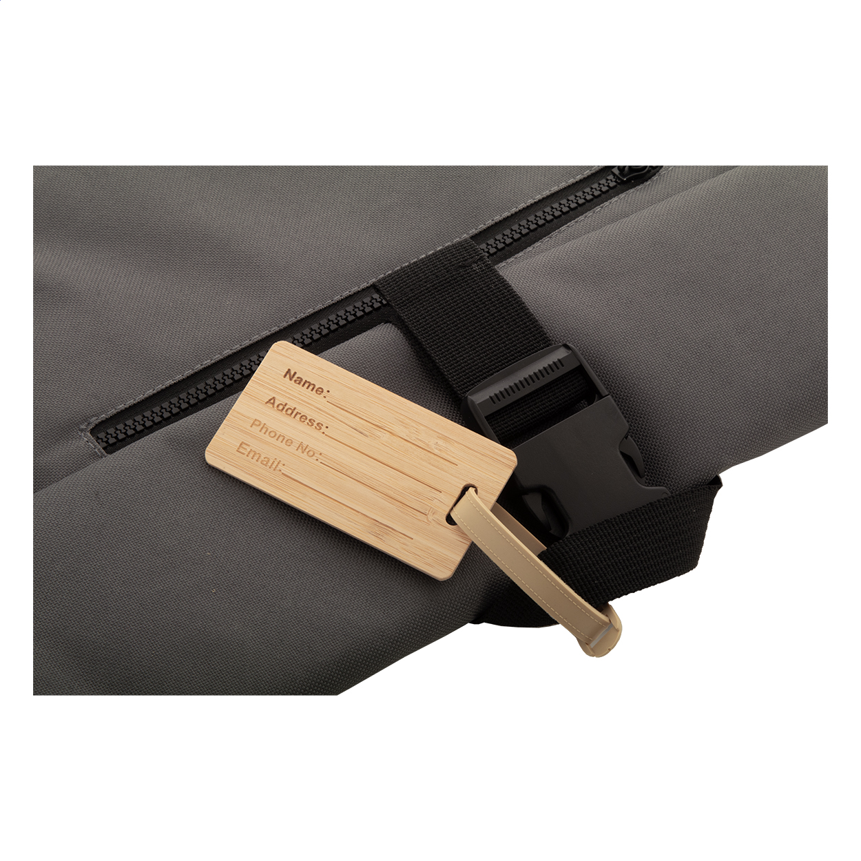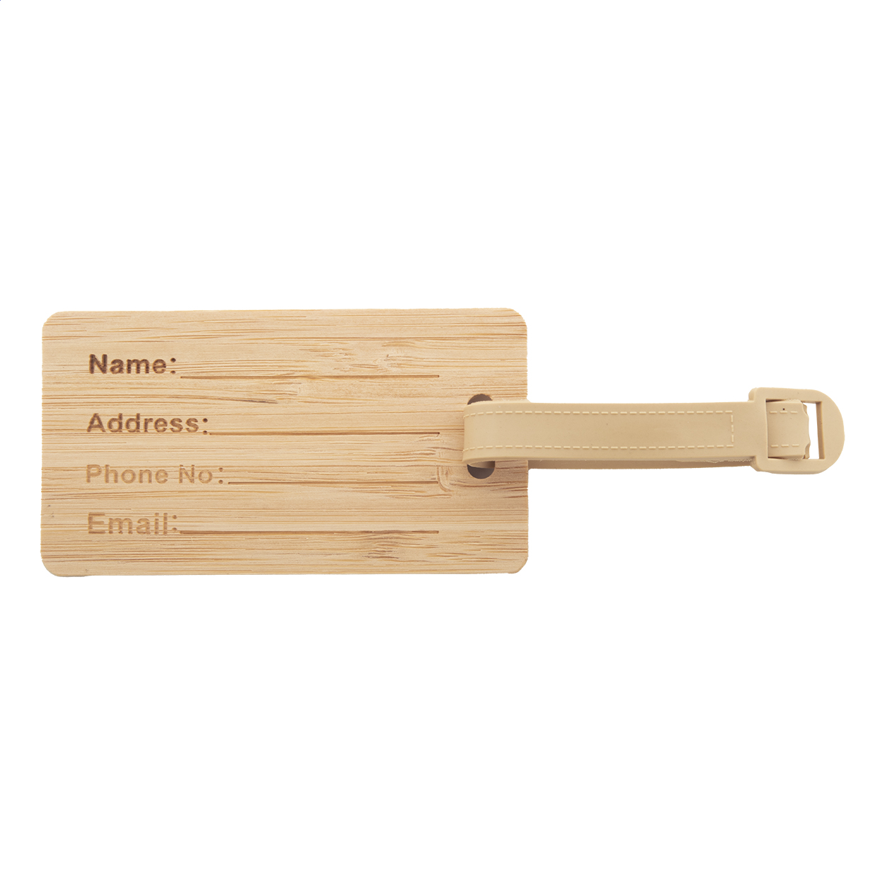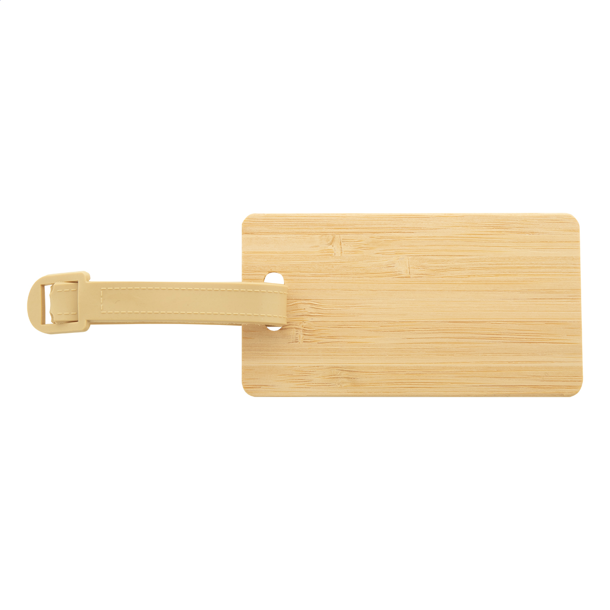 Etichetta per bagagli in bambù con laccetto e fibbia in plastica.