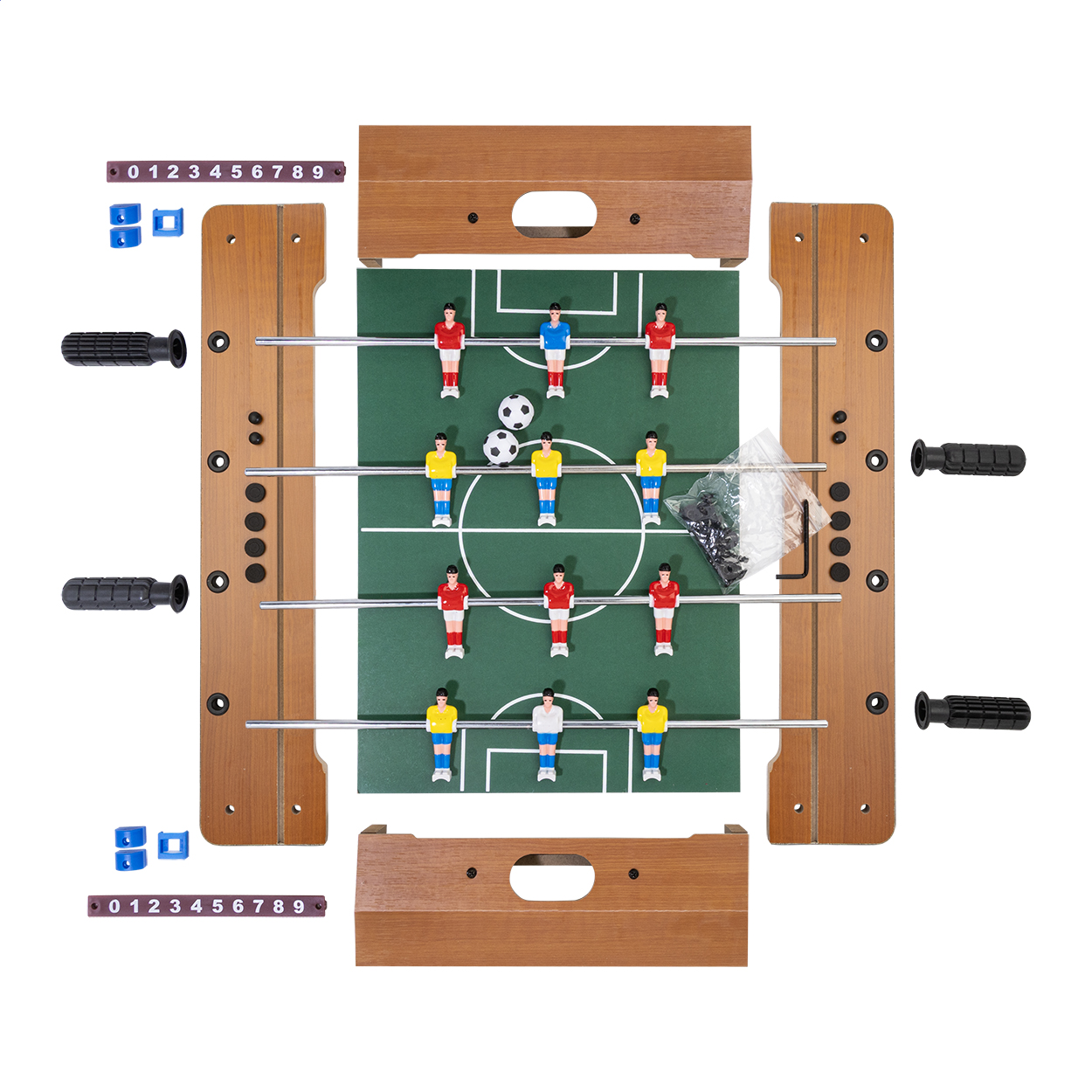 Mini calcio balilla realizzato in legno MDF con 2 palline e cursori per il punteggio. Fornito in confezione piatta da assemblare.