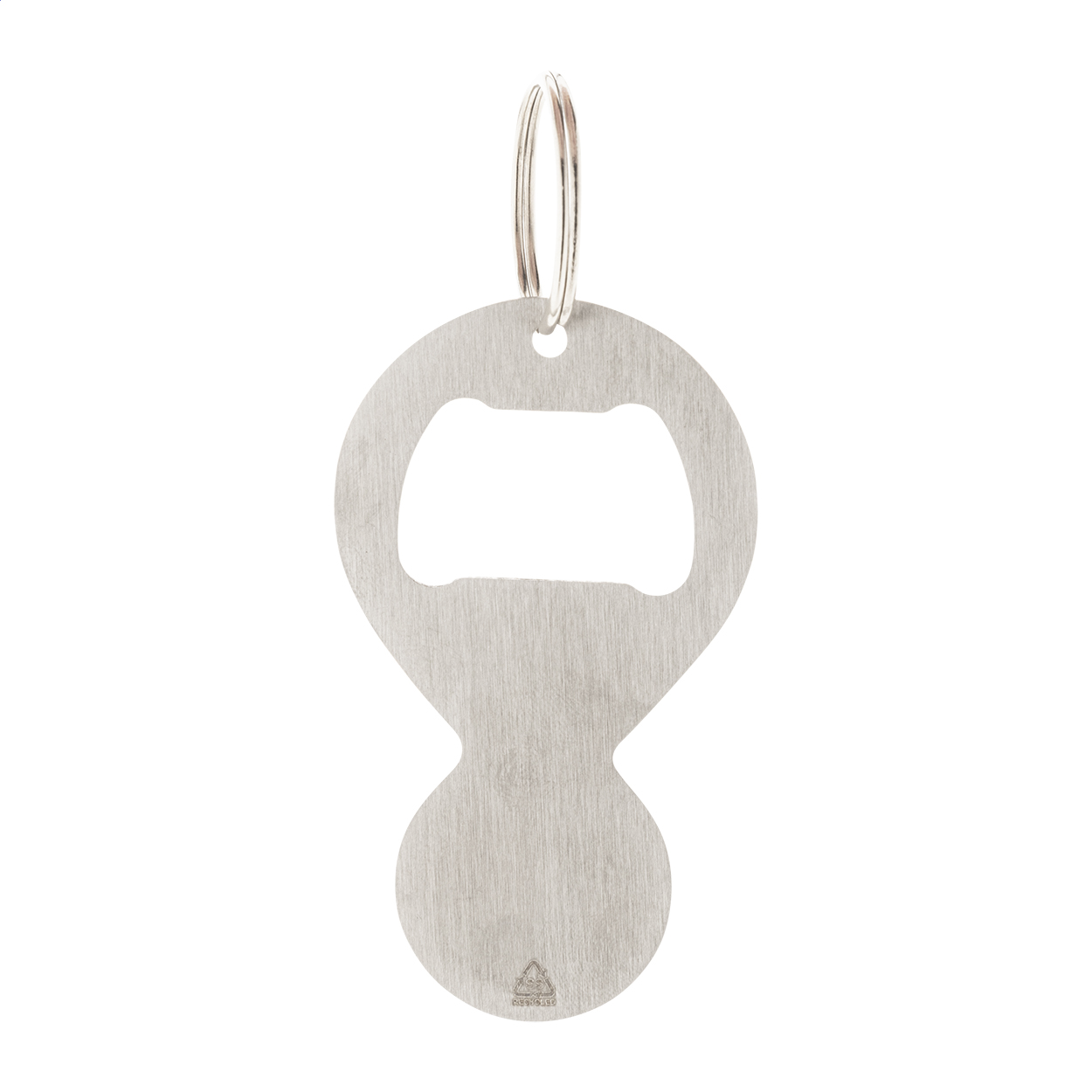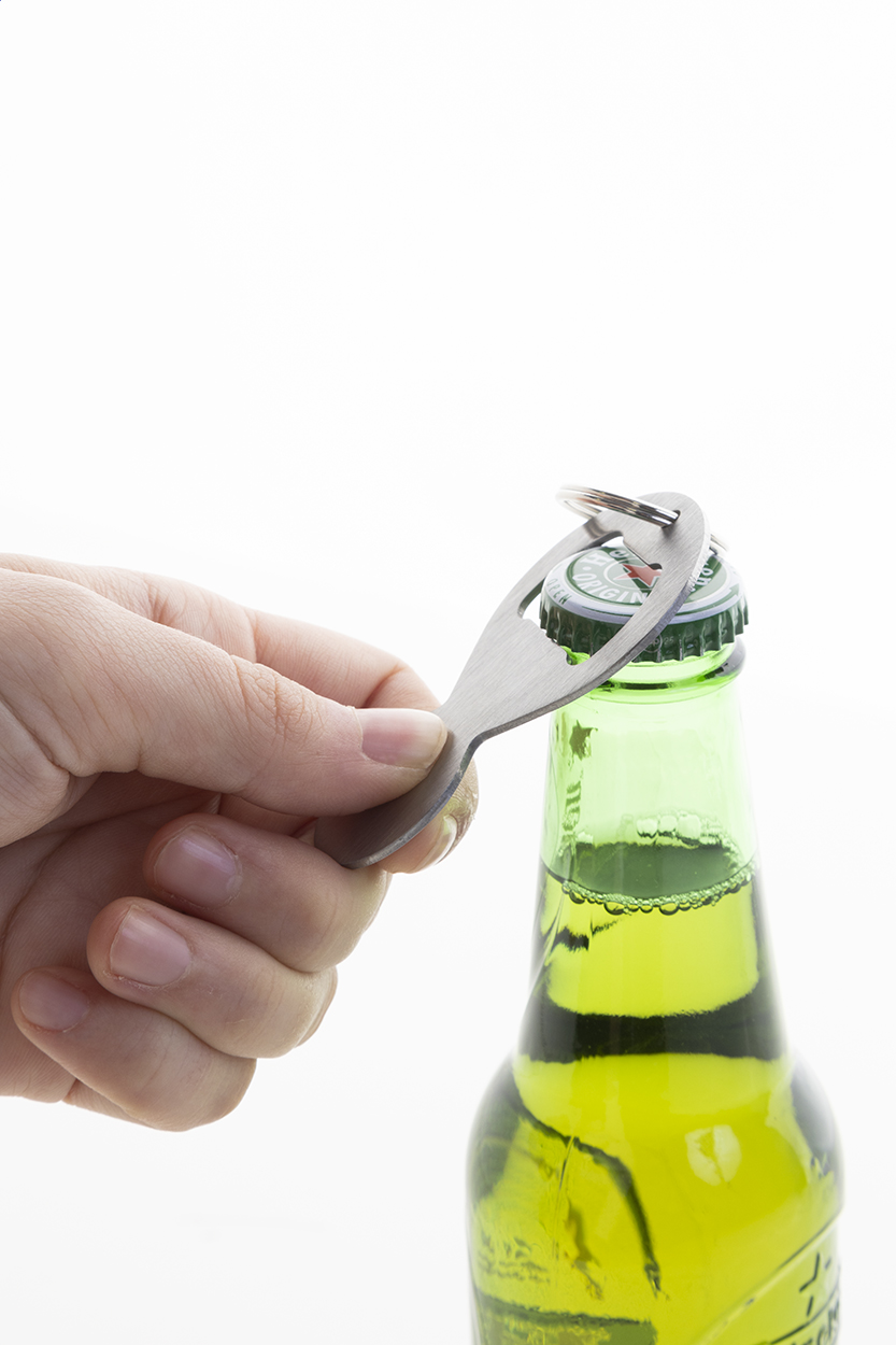 Portachiavi in acciaio riciclato con apribottiglie ed inserto per il carrello della spesa.